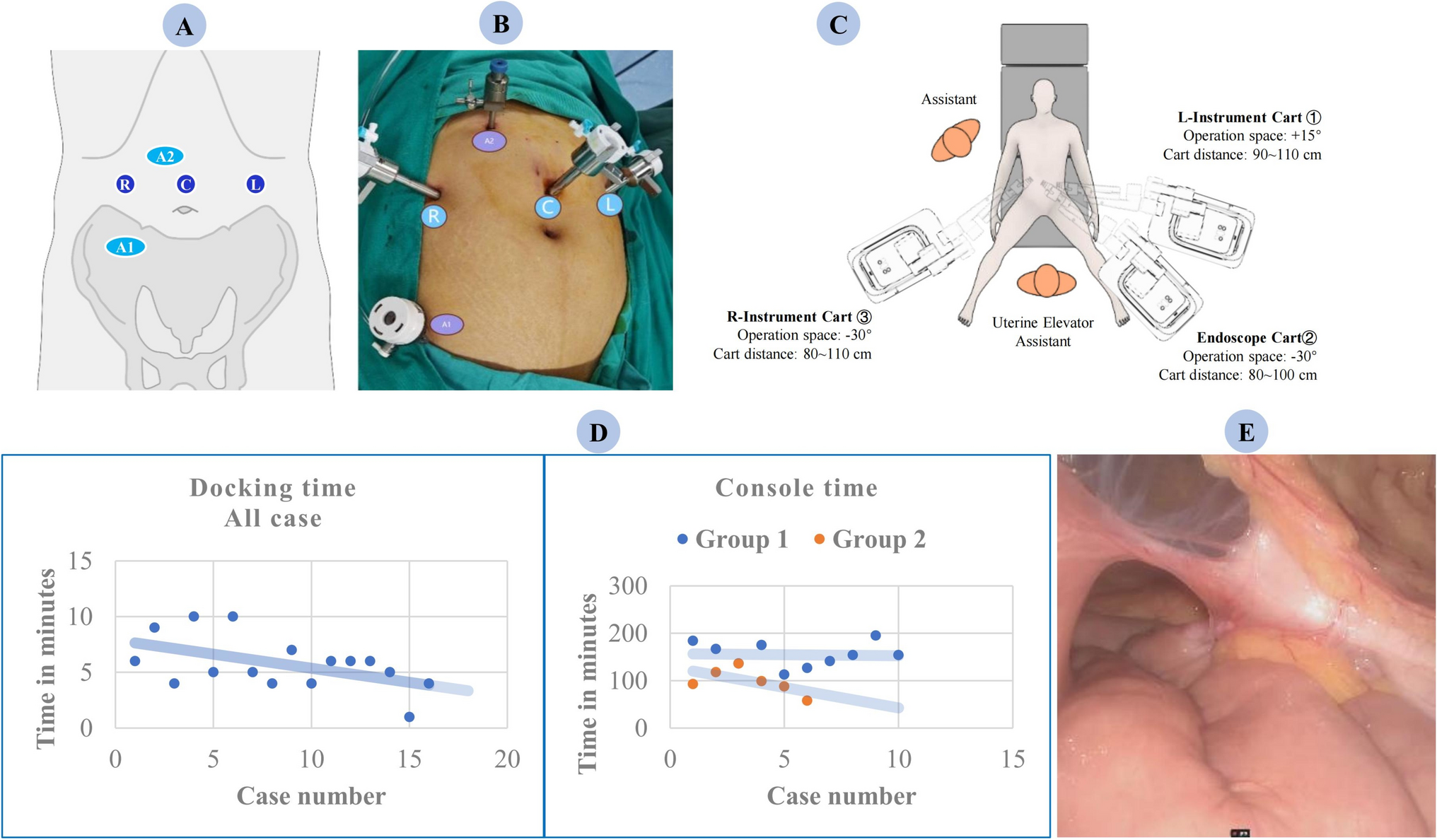 Port placement, patient cart positioning for RH, and intraoperative information collected. A Recommended port layout for RH. B Example of port placement for RH. C Recommended patient cart positioning for RH. D Docking time and console time for hysterectomy performed with Carina. E Intraoperative images of the special case
