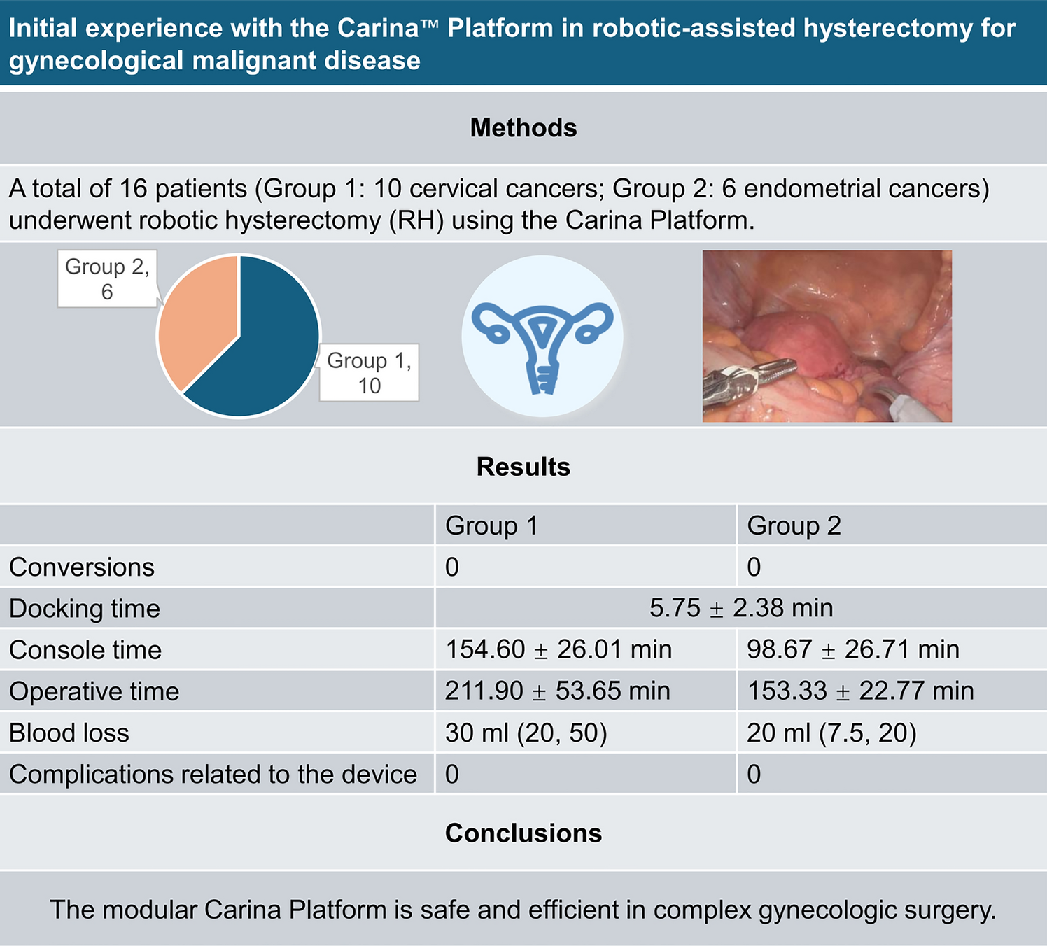 Our experience allows us to state that the modular Carina Platform is safe and efficient in complex gynecologic surgery.