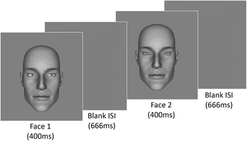 Experimental procedure showing a sample trial (with noise added to the second face) used in experiments 1 and 2. The same identity face was presented twice, and participants were required to indicate the direction of gaze in the second interval relative to the first
