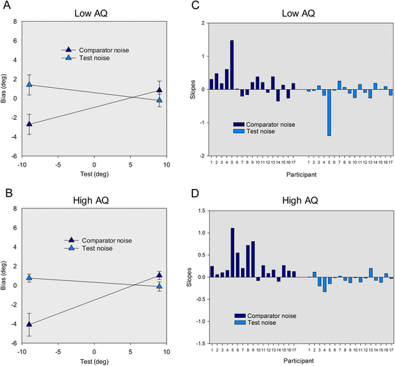 Following Mareschal et al. [25], linear fits were made through bias scores at the two test deviations (−9° and 9°). The direct gaze bias identified by Mareschal et al. [25] is characterised by a significant difference in the slopes of the fits, depending on whether noise was added to the test or to the comparator, with more positive slopes for the comparator noise condition and more negative slopes for the test noise condition. To test for this effect and potential effects of autistic traits, slopes were entered into a 2 × 2 ANCOVA with noise condition (test, comparator) as a within-participants factor and AQ group (high AQ, Low AQ) as a between-participants factor. Threshold (individual thresholds from the baseline noise threshold task) was included as a covariate to examine whether the relationship between slope and threshold differs across noise conditions.