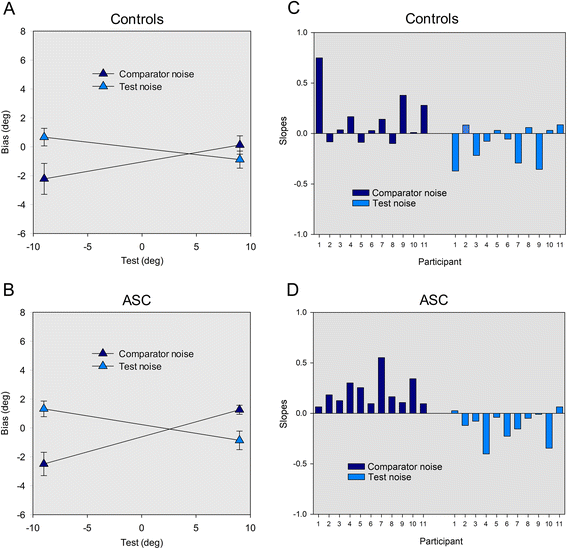 Experiment 2. Average bias scores data for (a) the control group and (b) the ASC group when the test contained noise (filled diamonds) and when the comparator contained noise (crossed diamonds) at each test deviations −9° and 9°. Individual slopes of the biases for all participants in the (c) control group and (d) the ASC group when the test contained noise (filled bars) and when the comparator contained noise (crossed bars)