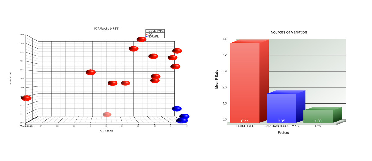 RNA obtained from the tumors and accompanying normal tissues was used to prepare cRNA for hybridization to the Affymetrix U133Plus 2.0 oligonucleotide arrays as described previously [15]. This analysis included 16 IDC samples and 4 control breast tissues. All procedures were carried out as specified by the manufacturer. Following hybridization to the U133Plus 2.0 arrays, the resultant raw CEL files were transferred to PARTEK Genomics Suite version 6.5 and normalized using GCRMA with quantile normalization to correct for variances in distribution patterns and GC nucleotide content. After performing the normalization, a PCA was used reduce dimensionality and to examine whether clusters could be explained by the first few principle components, which are ordered by the Eigen values of the covariance matrix. Analysis of Variance (ANOVA) was then performed on the entire data set. Figure 2 shows the histogram of variance and the PCA plot of the effect of the scan date on the data. A gene list was then generated using an FDR (Benjamini Hochberg) [18] of 0.05 and a 2 fold cut off for fold change. Figure 2 shows the histogram of variance and the PCA plot of the effect of the scan date on the data.