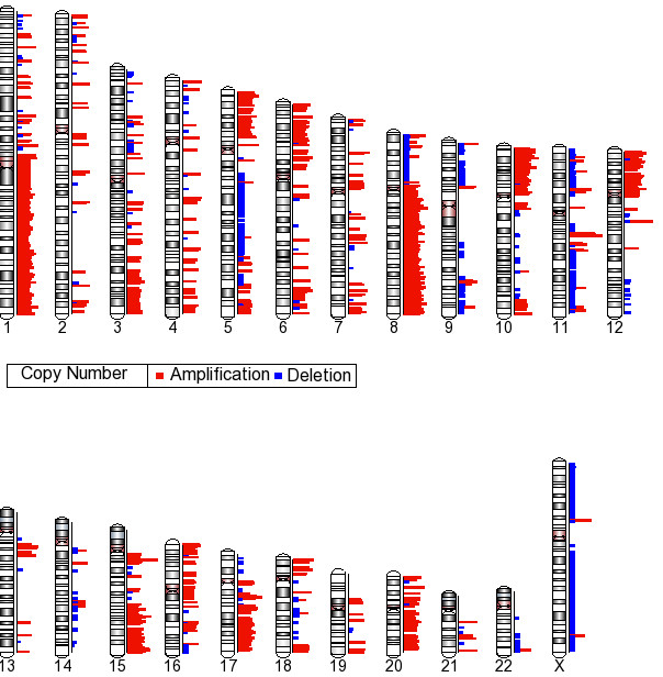 Following Genomic segmentation to obtain the different CN state partitions, the gains/losses and CN amplifications were identified. The CNA was required occur in at least 5/24 samples. Our final data summarization used cutoff values for copy numbers of 1.7 or less for losses and 2.3 or greater for CN gains. Figure 3 shows the ideogram of the copy number gains and losses. The length of each bar represents average copy number. Using these criteria, we found 6011 discreet regions of CN gains (3903) and losses (2018). Virtually every chromosome has regions of CNA.