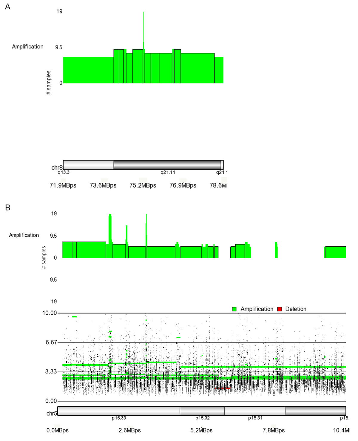 Minimal Regions of Overlap in Copy Number. A amplified region on chromosome 8q21.11 is shown in 4a. The minimal region of overlap has an average of 4.9 copies in 19 samples. This small region is 13 KB (8: 75237536-75250960) and is surrounded by an amplification or gain in 7-18 samples. This extended region is 90 KB and begins at 8p11 and extends to the telomere (8:41489634- 133808163). 4b shows an novel copy number region of gain at 5p15.33 where two minimal regions of overlap were detected. The first extends 101 KB (5:1836735-1938410) and the second is 19 KB (5:3180419-3199829) while the entire amplified region extends 5.6 MB from 5p15.33-p33.2 (5:165712-5779631). The bottom trace shows the SNP intensity plot for the region. The larger dots are smoothed data and the fine dots are unsmoothed. The first region has a mean of 3.5 copies and the second has 4.7.