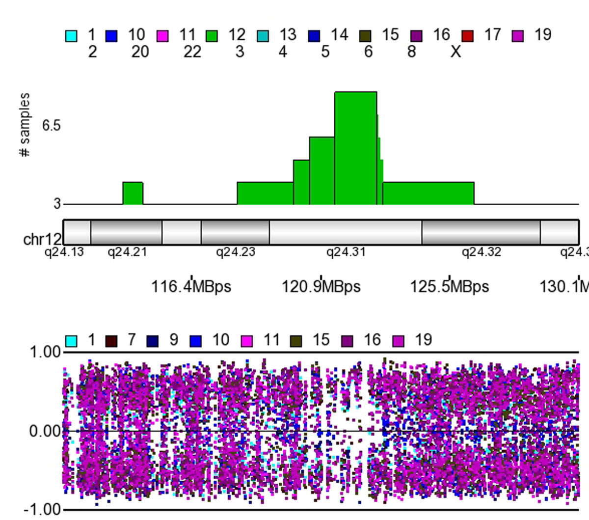 Allelic Ratio Plot of 12q24.3. The upper section of the figure plots the number of samples displaying LOH. The lower part of the diagram shows the allelic ratios plotted for each of the tumors defined by the colors shown above the plot. It is notable that the spots migrate towards 1 (AA calls) and -1 (BB calls) when the frequency of the LOH is increased, and as the frequency decreases, the more spots are plotted towards 0 (AB calls).