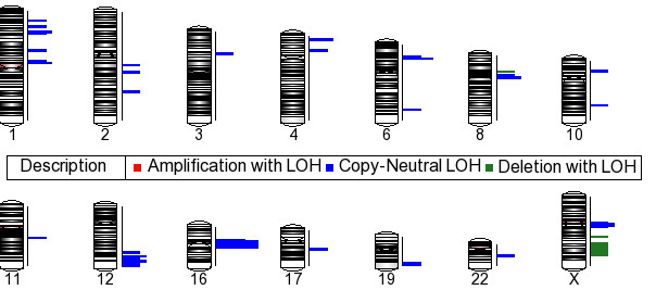 The assimilation of copy number and LOH data determines if regions of LOH overlap with regions of deletion or amplification or are copy neutral events. The criteria defined above for selecting LOH and copy number regions were also used in this analysis. Our integration analysis determined that most LOH events were copy neutral. Deletions with LOH were detected only on several regions of the X chromosome and a region at chromosome 8p12. No regions of amplification accompanied by an LOH event were detected. The integration plot is shown in figure 7, with the length of the bars representing the number of tumors carrying the LOH event