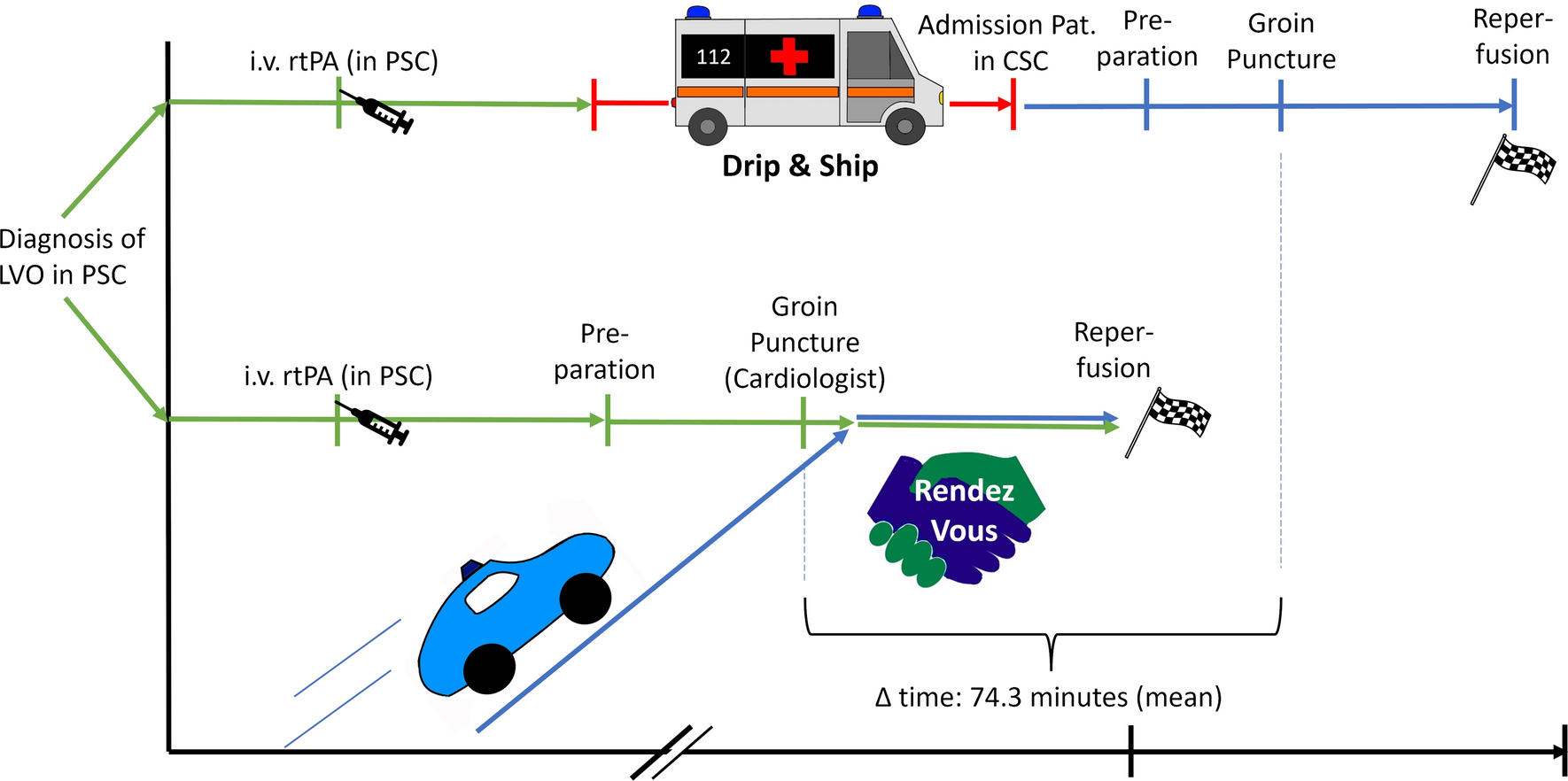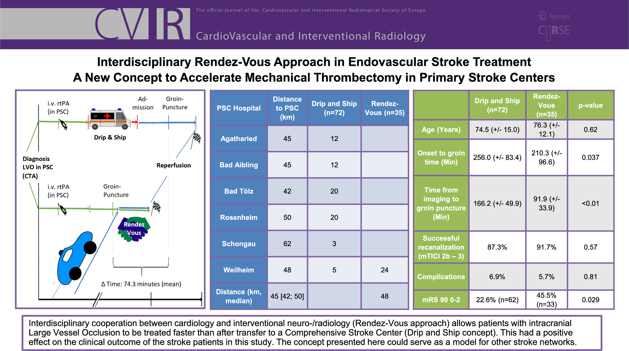 Drip and Ship (n = 72) | Rendez-Vous (n = 35) | P value | |