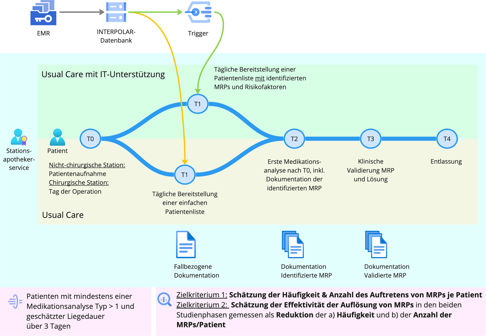Das primäre Ziel von INTERPOLAR‑1 ist es, in einem multizentrischen Setting den konfirmatorischen Nachweis zu erbringen, dass bei Usual Care mit operationalisierter IT-Unterstützung (UC + IT) insgesamt mehr MRPs erkannt und behoben werden als bei Usual Care (UC).