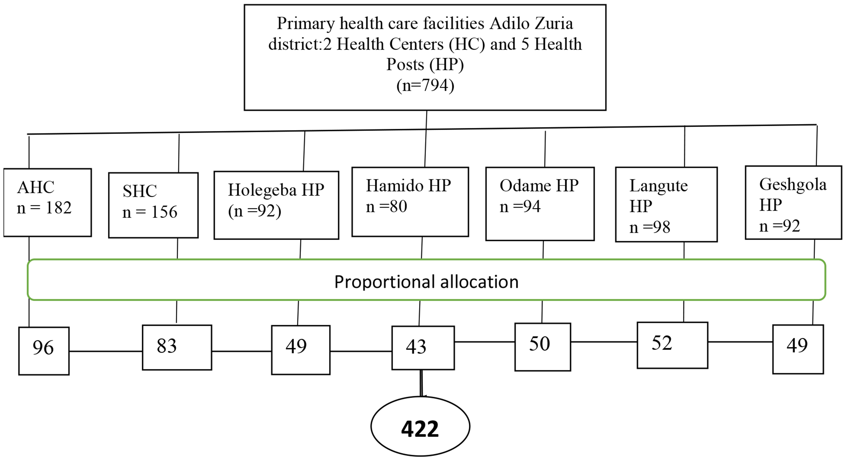 th) of 2 (794/422). The first study participant was selected using lottery method, and consecutive study participants were recruited every two women attending family planning clinic. The calculated sample size was proportionally allocated to each primary healthcare facility (Fig.