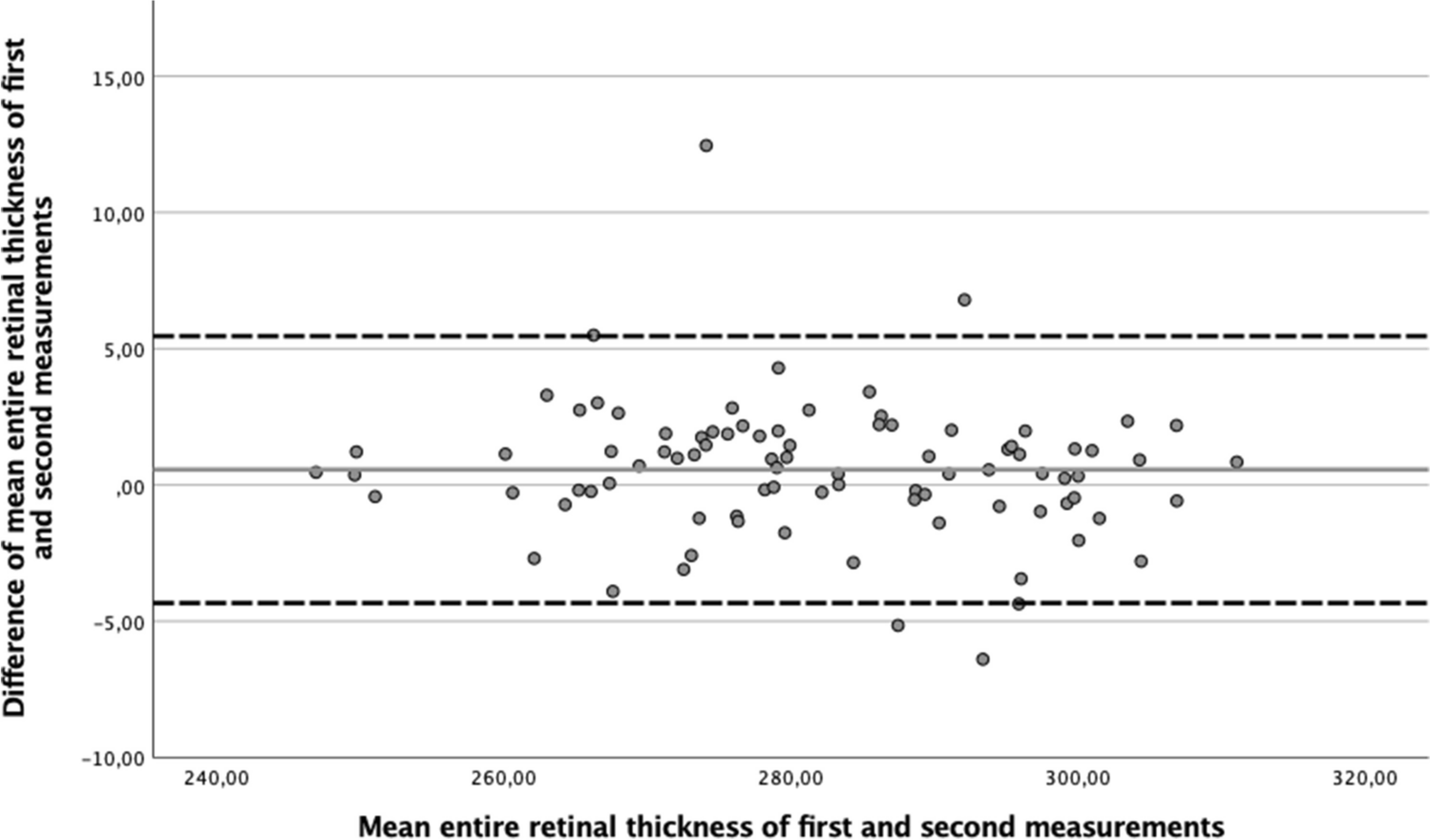 Bland-Altmann plot showing the intraday repeatability of two measurements (n = 88) of the entire retinal thickness in the glaucoma group
