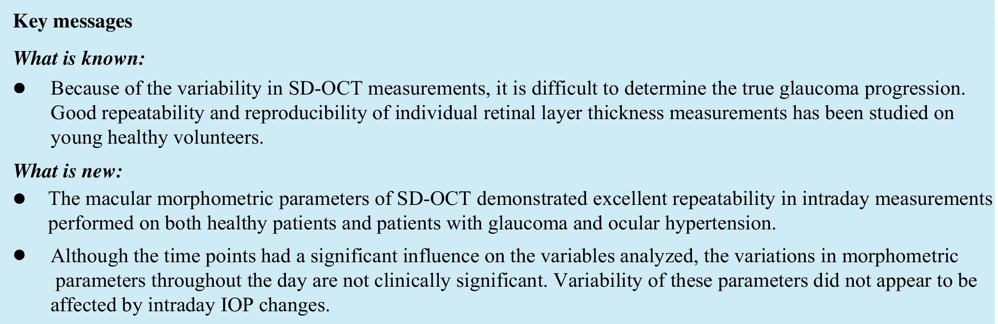 Limitations of this work include the relatively small number of patients in the glaucoma group and the OHT group. In this study, only the inner retinal layers were examined because of the already proven changes that occur in them by the progression of glaucoma [23, 24]. To obtain a complete picture of the possible intraindividual variations of macular morphometric parameters during the day, it would be useful to study all retinal layers. The good documentation of the morphometric parameters of the retina thanks to high-resolution SD-OCT is an advantage of this work. The variation of retinal vascular characteristics of the macular region and its possible influence on intraindividual variation in macular morphometric measurements should be investigated with the help of optical coherence tomography angiography (OCT-A) in future studies.