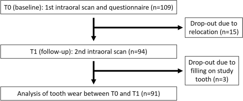 Due to relocation, 15 participants dropped out of the study at T1 and three more participants were excluded due to restoration in the study tooth. Thus, data from 91 participants were analysed in this study.