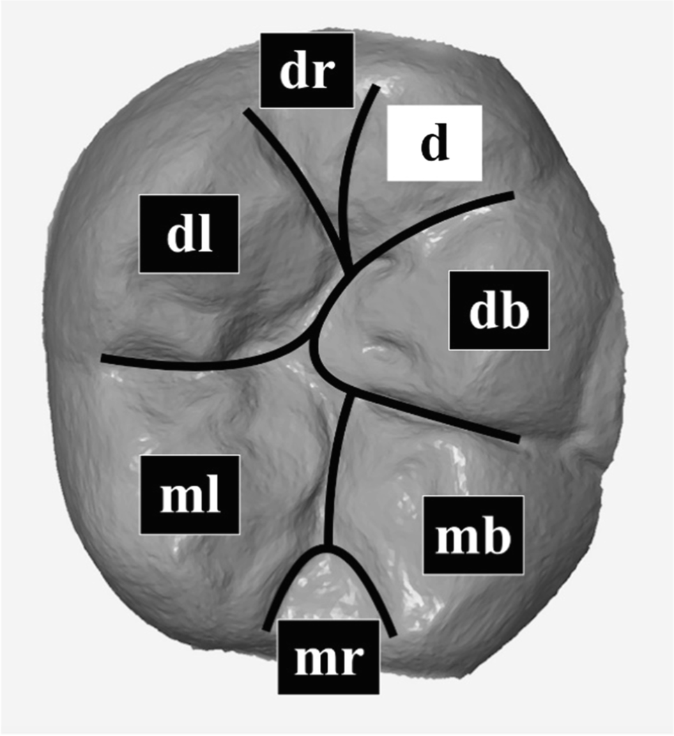 Classification of the occlusal surface of each study tooth distributed into seven areas: mesiobuccal (mb), distobuccal (db), mesiolingual (ml), distolingual (dl) and if existing distal (d) cusp as well as mesial (mr) and distal ridge (dr)