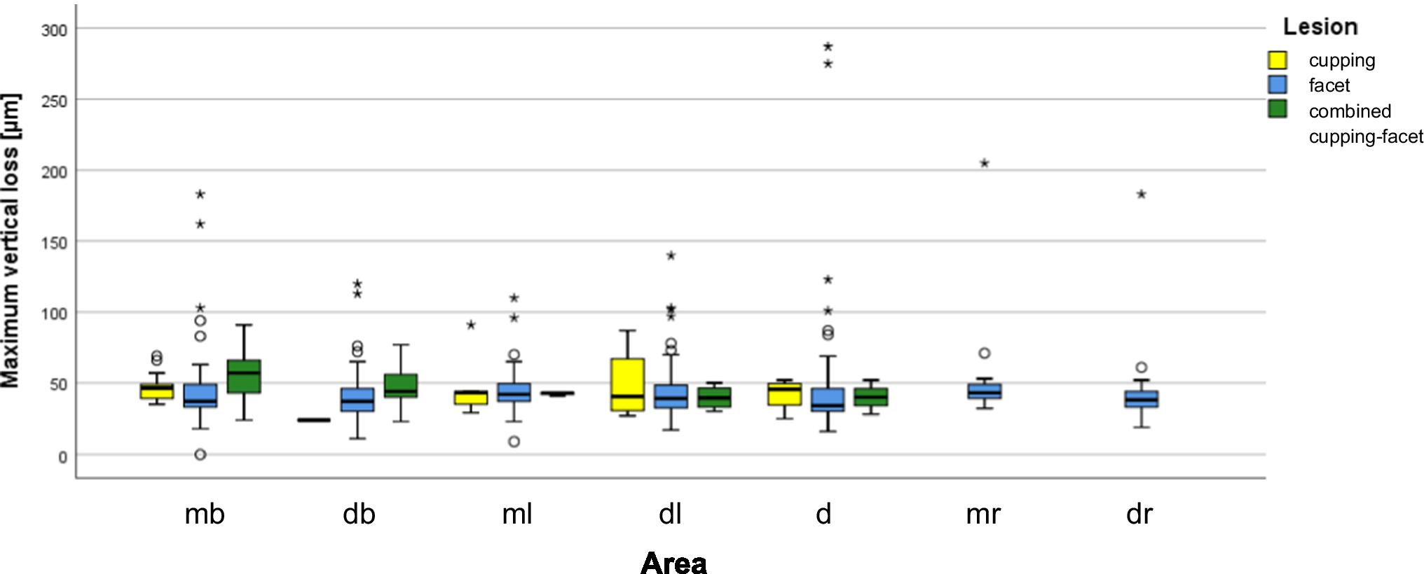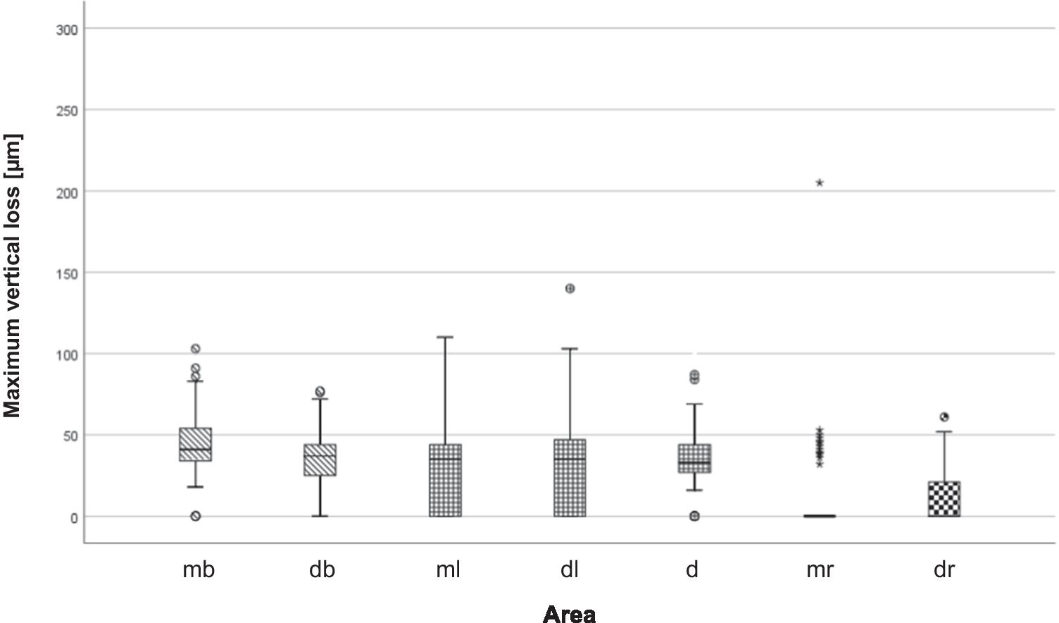 Only one study tooth exhibited no tooth wear at T0, whereas 3 teeth showed C, 47 teeth F and 40 teeth CF. A progression of vertical substance loss for all three types was shown. Most affected were the mesiobuccal cusps (43, 38/47 µm; median, 95%CI) followed by distobuccal (36, 33/39 µm), mesiolingual (35, 26/40 µm), distolingual (34, 27/36 µm) and distal (31, 25/34 µm). On mesial and distal ridges, only F was detected with the lowest vertical substance loss of all areas (mesial ridge: 0, 0/0 µm; distal ridge: 0, 0/0 µm). An association between aetiological factors and loss values could not be shown.