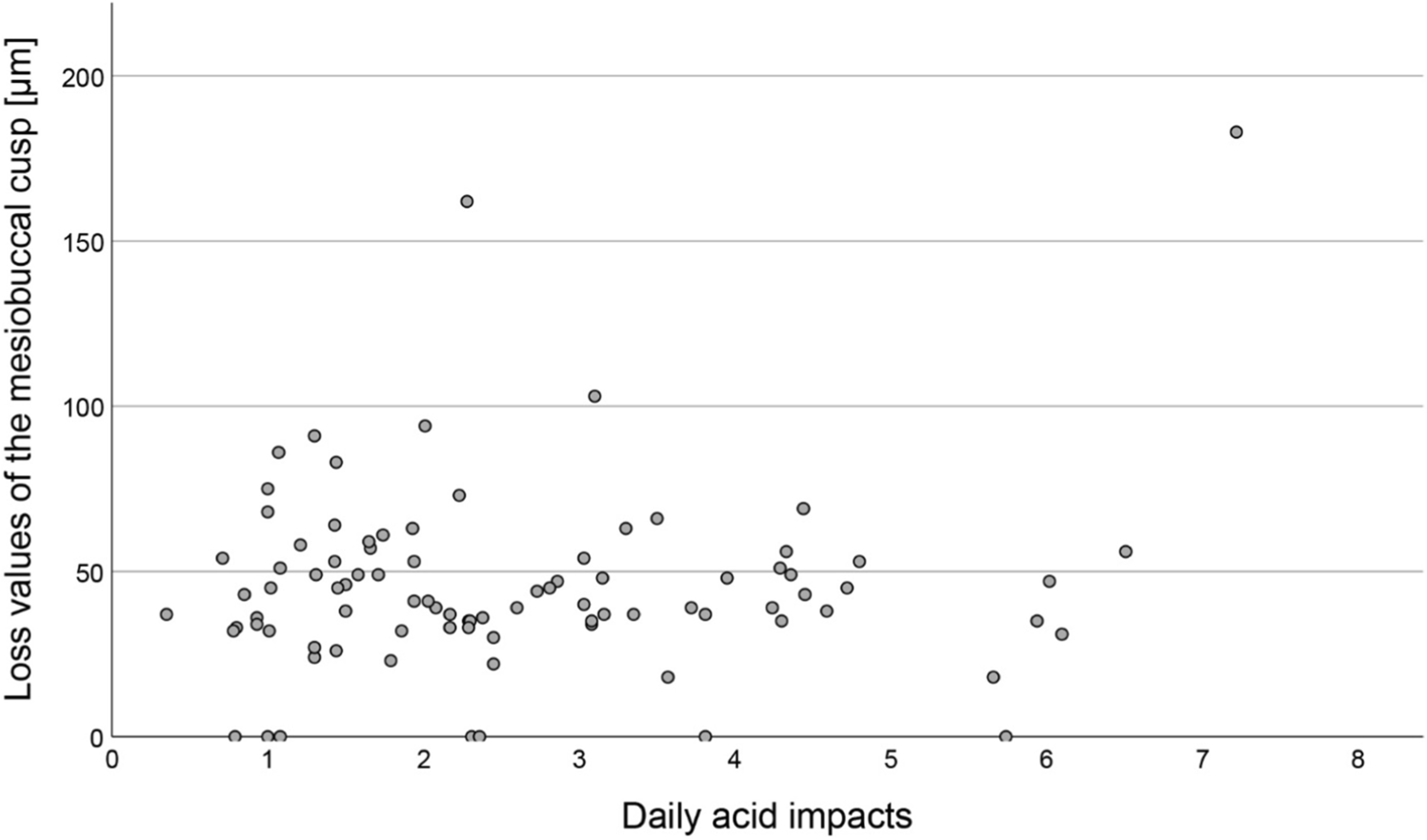 Correlation between the number of daily acid impacts and loss values [micrometre] of the mesiobuccal cusp (n = 89, calculation is presented in the Supplementary Information)