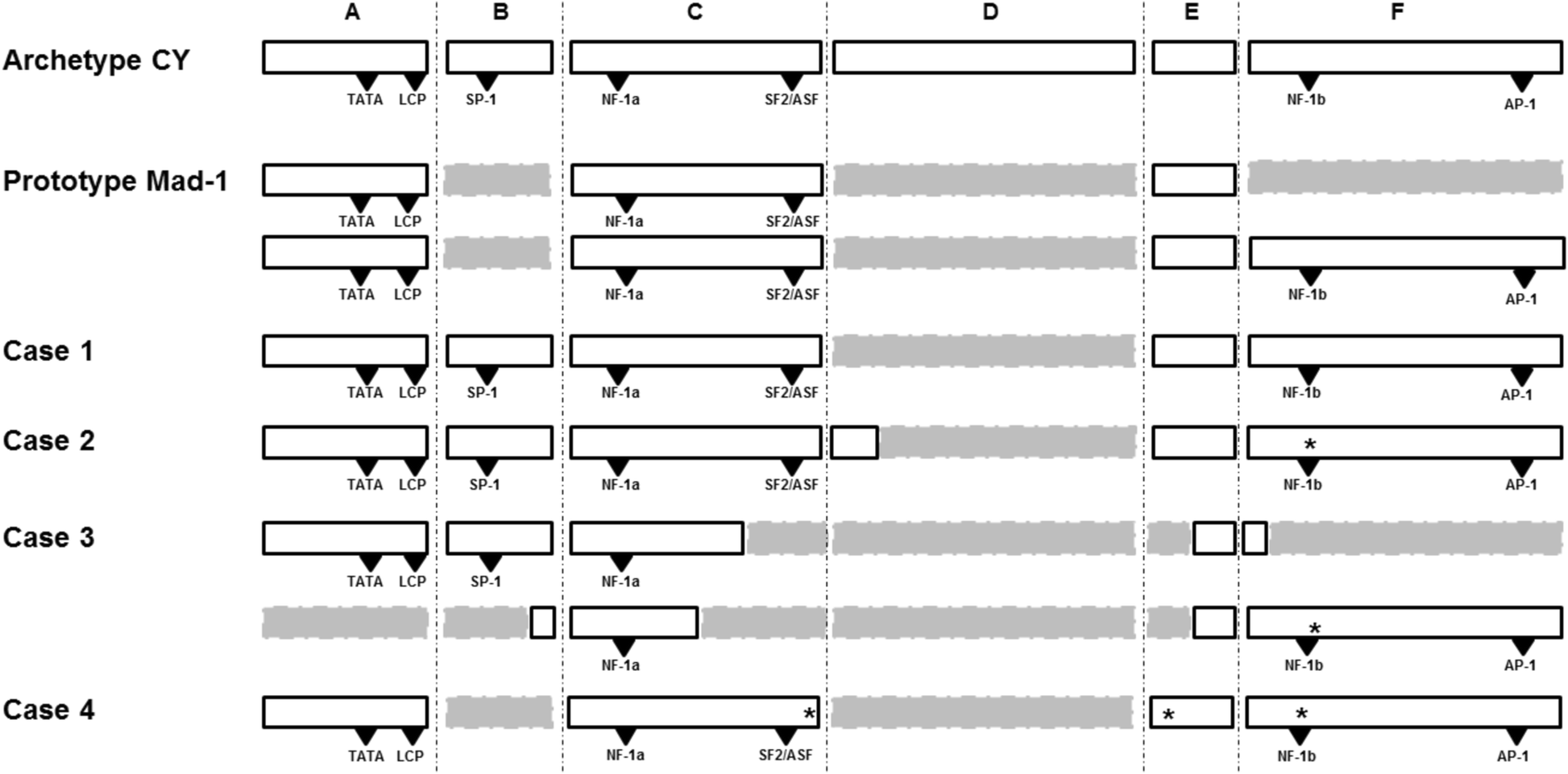 The JCPyV NCCR sequences from CSF of four PML patients. The JCPyVNCCR sits between the viral early gene large T and the late gene agnoprotein and is a 267 base pairs sequence, in the archetype CY strain. The 267 bases are conventionally organized into 6 unequal fragments, namely from A to F: A from 1 to 36, B from 37 to 59, C from 60 to 114, D from 115 to 180, E from 181 to 198, F from 199 to 267 bases [12, 20]. Archetype CY and Mad-1 NCCRs are shown for comparison. Delated blocks are represented in grey with dotted lines. Asterisk (*) represents single nucleotide polymorphism. Transcription factor binding sites are represented by triangles. TATA: tata box; LCP: lytic control element-binding protein; SP-1: specificity protein-1; NF-1a: nuclear transcription factor 1a; SF2/ASF: splicing factor 2/alternative spicing factor; NF-1b: nuclear transcription factor-1b; AP-1: activating protein-1