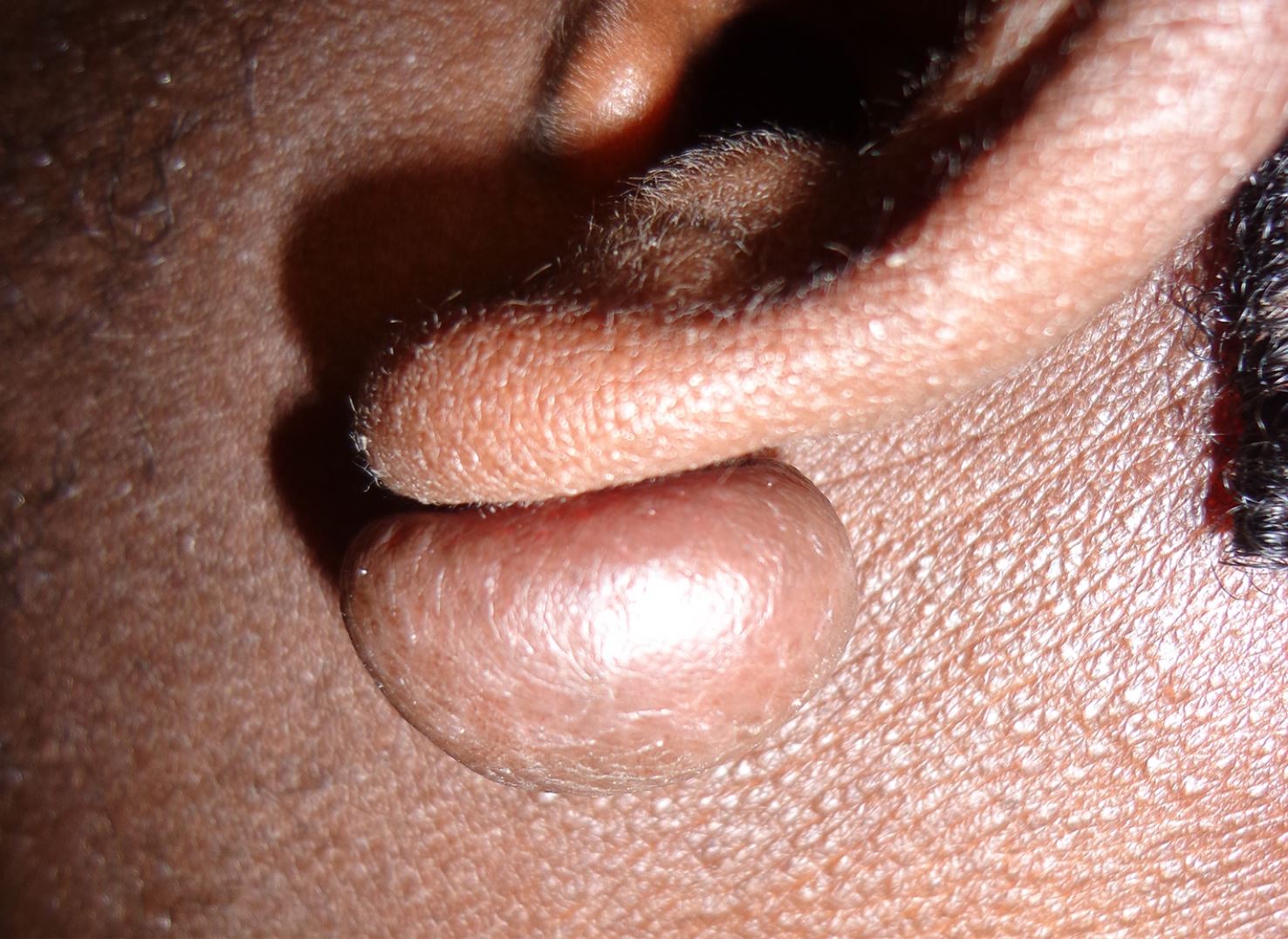 Ein 18-jähriger Westafrikaner hatte in der linken dorsalen Ohrläppchenregion eine Gewebevermehrung bemerkt, die mit der Zeit immer größer geworden war. Als sie etwa auf die Größe einer Kirsche angewachsen war, kam er zur Abklärung in die Hautklinik.