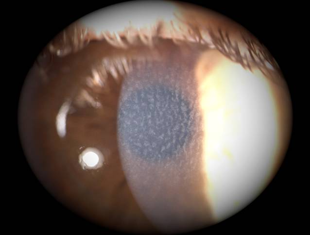 Ein 30-jähriger Patient stellte sich einen Tag nach einer keratorefraktiven Lentikelextraktion (KLex, SMILE), die zur Myopie- und Astigmatismuskorrektur durchgeführt wurde, ohne subjektive Beschwerden zur routinemäßigen Kontrolle vor. Der unkorrigierte Visus betrug 0,8. An der Spaltlampe fiel dieser Befund auf (Abb. 1). Wie lautet Ihre Blickdiagnose?