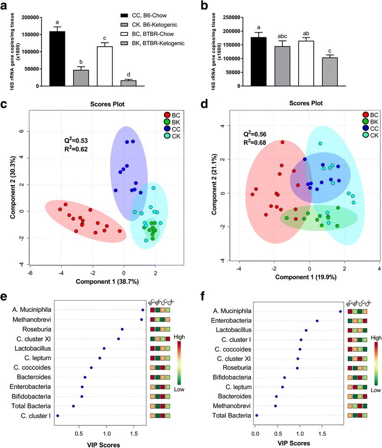Assessment of total microbial content, partial least squares discriminant analysis (PLS-DA), and variable importance of projection (VIP) scores for relative bacterial abundance. Descriptive comparisons of total microbial content, score plots of PLS-DA, and VIP scores for both cecal and fecal matter are presented. a Total bacterial species composition measured from cecal matter. b Total bacterial species composition measured from fecal matter. c PLS-DA score plot for cecal matter showing model discrimination between each genotype. d PLS-DA score plot for fecal matter showing model discrimination between each genotype. e Cecal VIP plot indicating the most discriminating bacteria in descending order of importance. f Fecal VIP plot indicating the most discriminating bacteria in descending order of importance. Statistical comparisons between genotype and diet were determined by ANOVA, followed by Tukey’s post hoc test. PLS-DA and VIP scores were assessed using MetaboAnalyst 3.0. Ellipses represent 95 % confidence intervals for each individual group on PLS-DA plots with Q2 and R2 values being used to assess the robustness of the model and the amount of variation represented by the principal components, respectively. VIP scores reflect the degree of importance of a bacteria, with values >1.0 seen as driving the calculated discrimination. All data were collected using qRT-PCR and are presented as mean 16S rRNA gene copies/mg of corresponding tissue ± SEM (CC, B6-chow; CK, B6-ketogenic; BC, BTBR-chow; and BK, BTBR-ketogenic; n = 11, 10, 15, and 10, respectively). p < 0.01 if values do not share a superscript letter. An adapted version of this table has been previously published. Reprinted with permission of the American Chemical Society, Copyright 2016