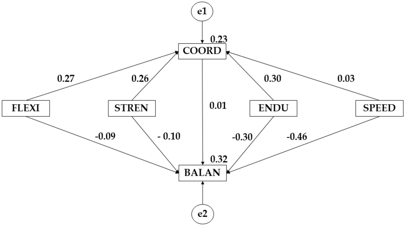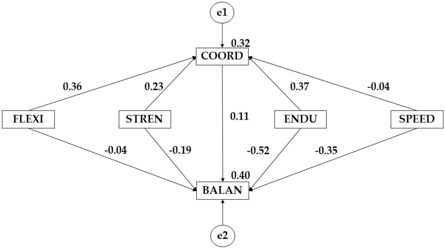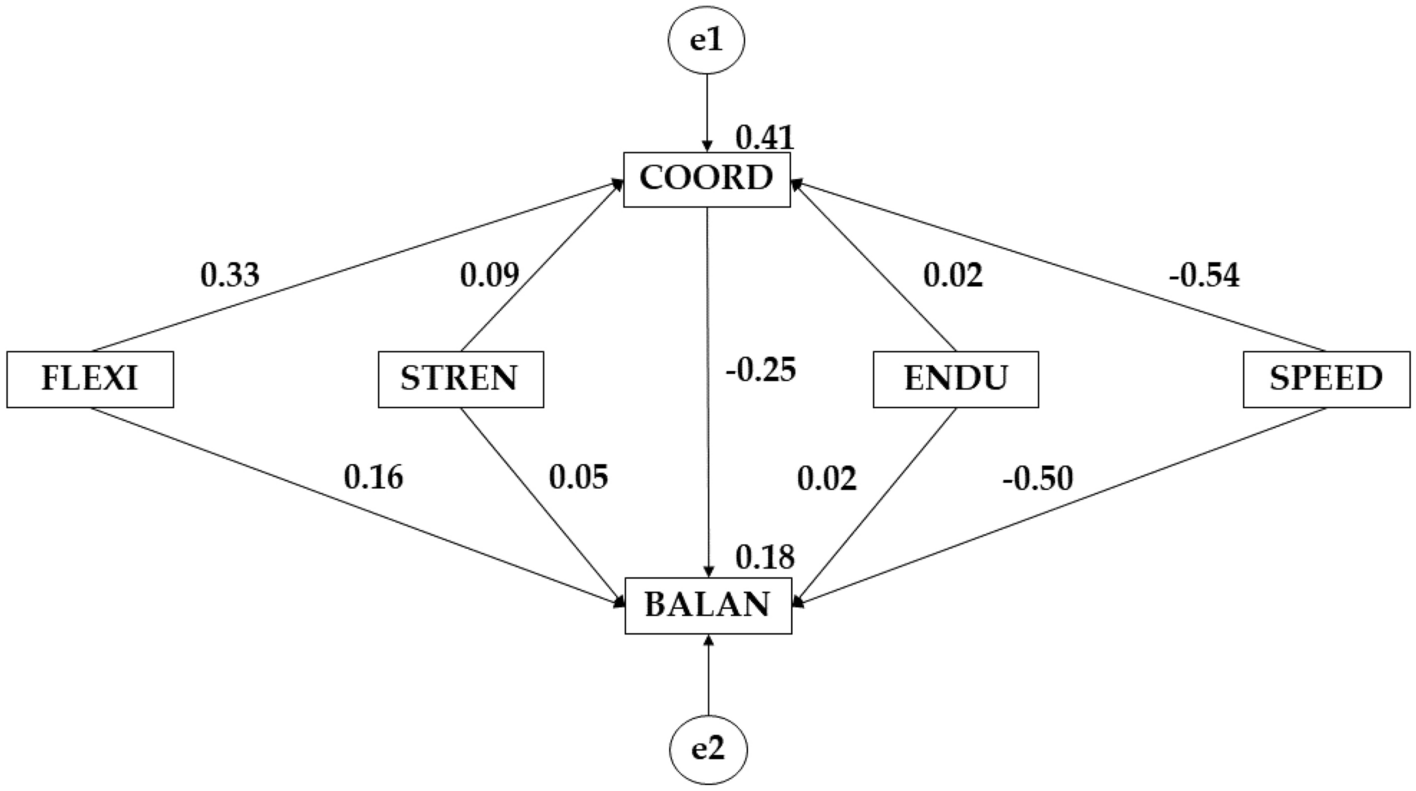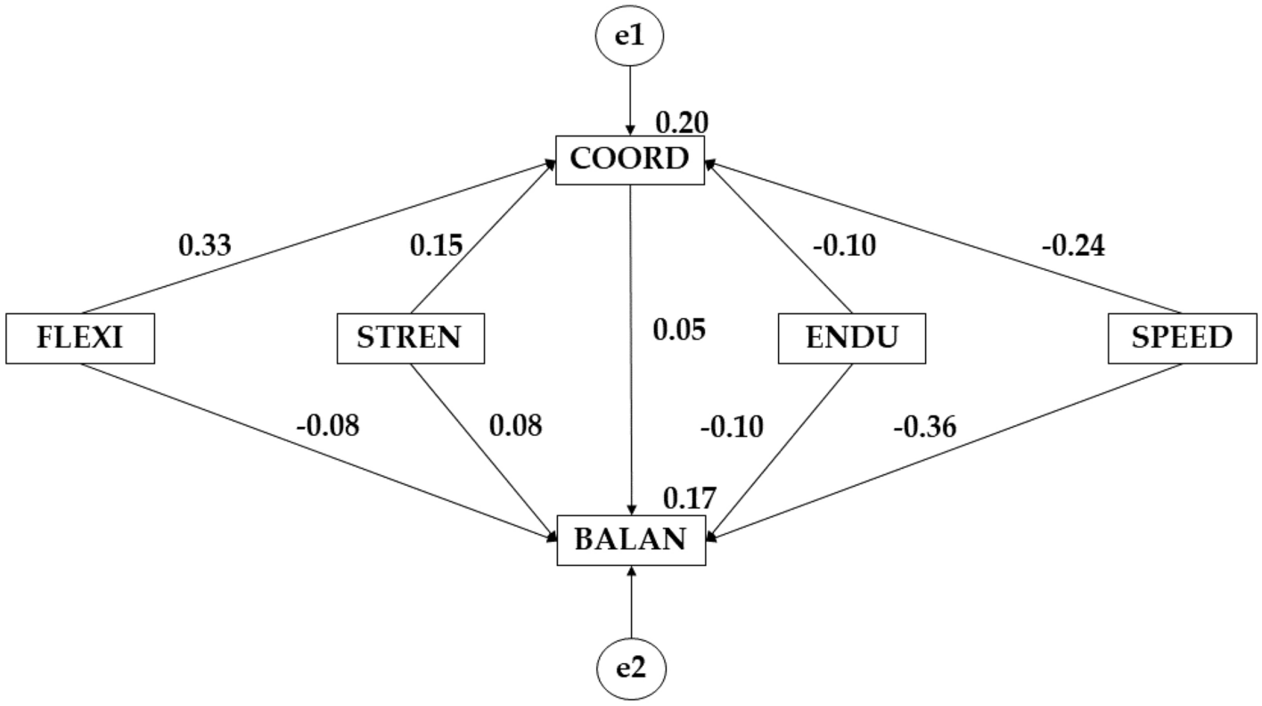 In this case it is observed that the female sex shows a better effect of flexibility on coordination (β = 0.326; β = 0.274). Likewise, a better effect is also observed for the female sex between flexibility and balance (β = −0.082; β = −0.088), strength and balance (β = 0.084; β = −0.096), endurance and balance (β = − 0.104; β = −0.301) speed and balance (β = −0.364; β = −0.463 p ≤ 0.05) and between coordination and balance (β = 0.046; β = −0.004). On the contrary, it is observed that the male sex shows a better effect between strength and coordination (β = 0.261; β = 0.147), endurance and coordination (β = 0.296; β = −0.103) and strength and coordination (β = 0.030; β = −0.241) (Tables 3, 4; Figs. 1, 2).
