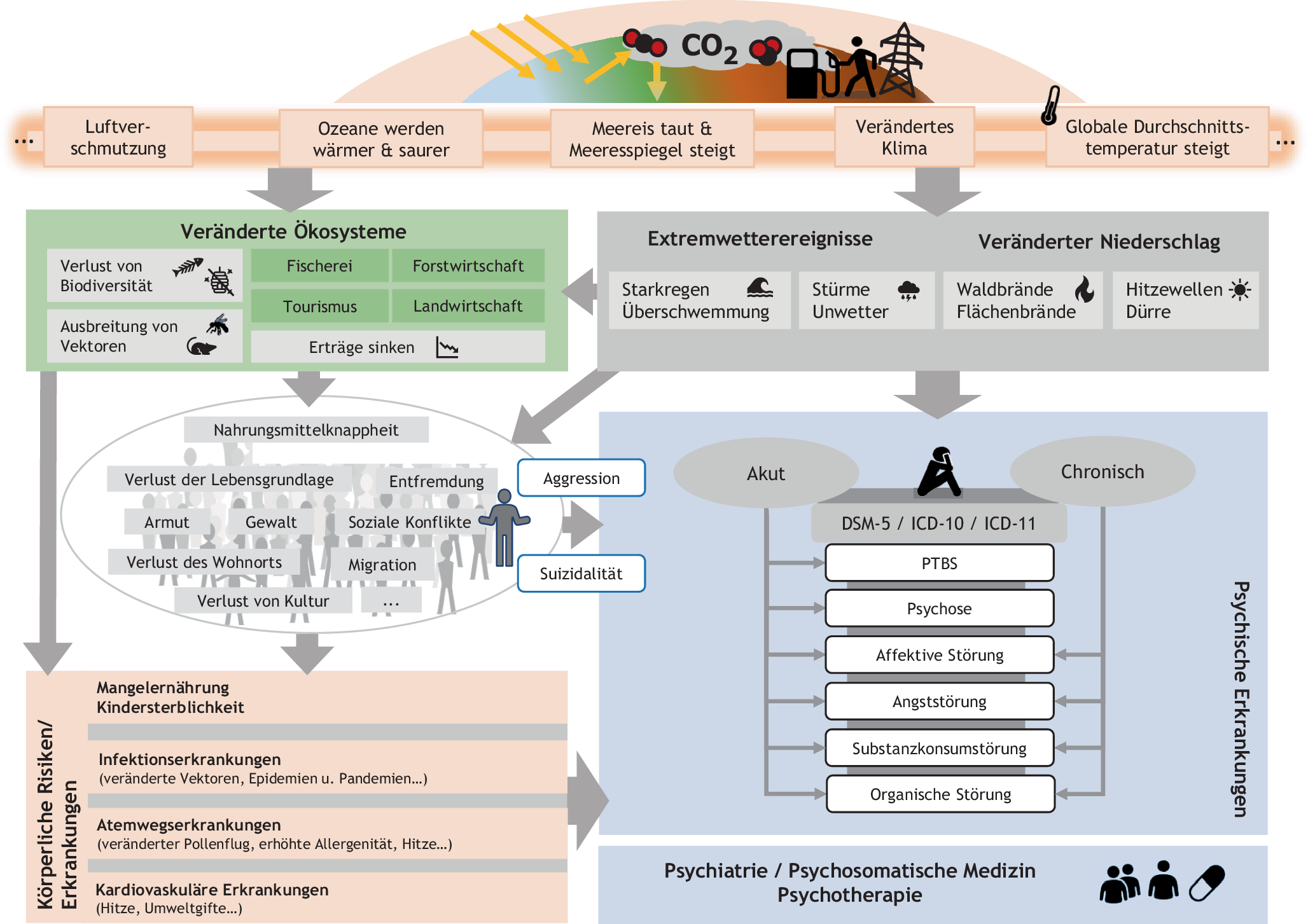 Die insbesondere in der rechten Bildhälfte in Abb. 1 gezeigten Zusammenhänge zwischen Klimaveränderungen und psychischer Erkrankung sind wissenschaftlich belegt und werden u. a. im Positionspapier der DGPPN-Taskforce „Klima und Psyche“ erläutert [20].