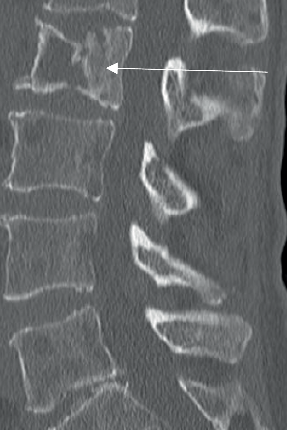 Computertomographisch erkennbare Wirbelkörperfraktur mit Deckplatteneinbruch (Pfeil) bei insgesamt multiplen ossären Läsionen [1]. (Aus [4])