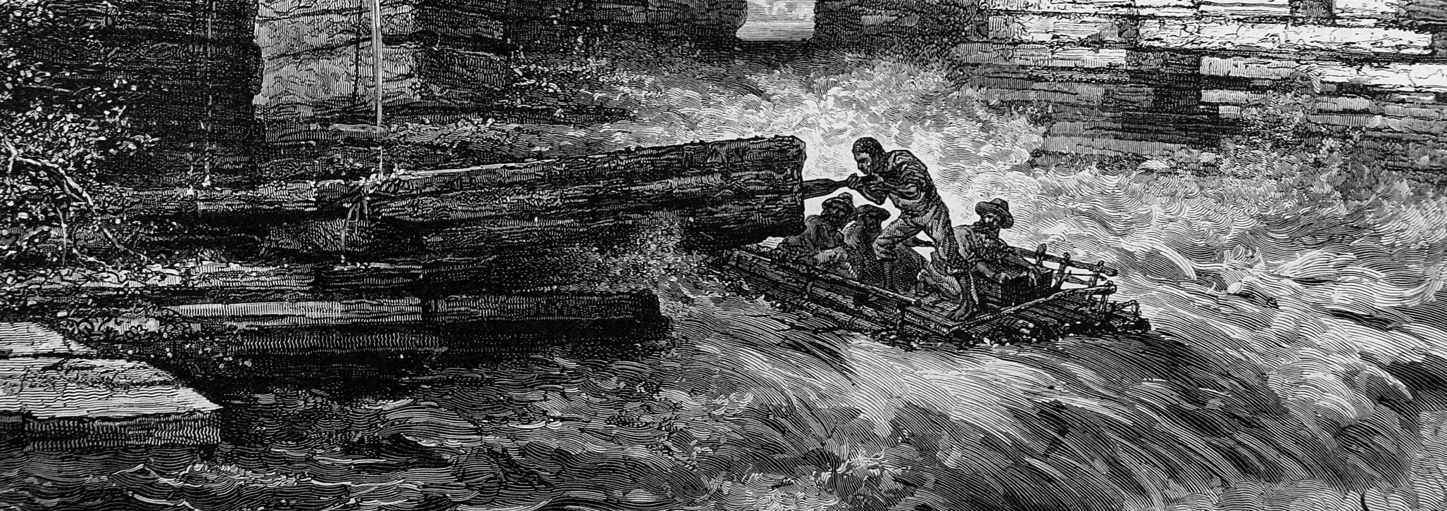Die Lewis-und-Clark-Expedition passiert die erste Stromschnelle. Kupferstich von A. Sargent, 1881