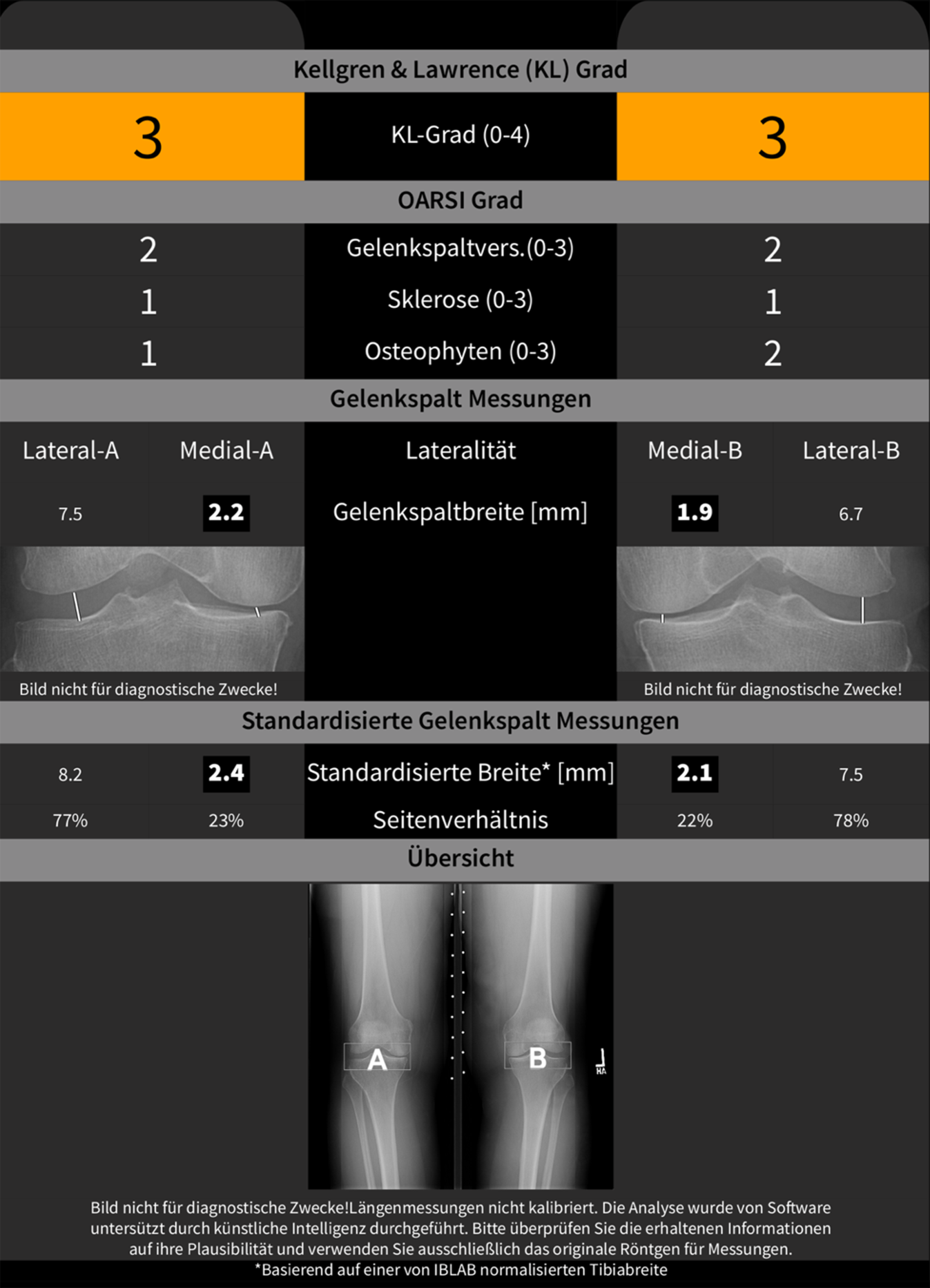 Radiologisch äußert sich die fortschreitende Arthrose durch eine Verschmälerung des Gelenksspaltes, eine Zunahme der subchondralen Sklerose mit progressiver Zystenbildung in den gelenknahen Strukturen, Kalzifizierung und Osteophytenbildung sowie einer zunehmenden Achsabweichung aufgrund der damit verbundenen Bandinstabilitäten und Knochendeformationen. Die Gradierung der Arthrose erfolgt in klassischer Weise nach dem Kellgren-Lawrence-Score, der subjektiv semiquantitativ vier Kriterien (Gelenkspalt, Sklerosierung, Verformung und Osteophyten) erfasst, damit aber eine geringe inter- und intraindividuelle Reproduzierbarkeit aufweist. Die Anwendung von digitalen Analyseverfahren in der muskuloskelettalen Bildgebung ermöglicht es, vollautomatisch mithilfe neu entwickelter Algorithmen konventionelle Röntgenbilder auf Frühzeichen einer Arthrose zu untersuchen. Dadurch lässt sich die hohe Befundvariabilität des Kellgren-Lawrence-Scores und damit auch die Datenqualität in Arthrosestudien deutlich verbessern [10]. Die Analyse des gesamten Datensatzes eines digitalen Röntgenbildes lässt auch Analysen der ossären Mikrostruktur zu, wobei Aufbau und Zusammensetzung des subchondralen Knochens im Vordergrund stehen. Durch „deep learning“-Algorithmen der künstlichen Intelligenz können Frühzeichen der Arthrose detektiert werden, wodurch Risikoprofile und Prognosewerte für die Arthroseentstehung generiert werden und somit therapeutische bzw. präventive Maßnahmen rechtzeitig begonnen werden können ([11]; Abb. 1).