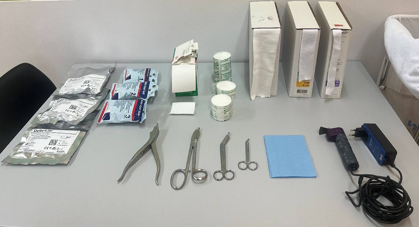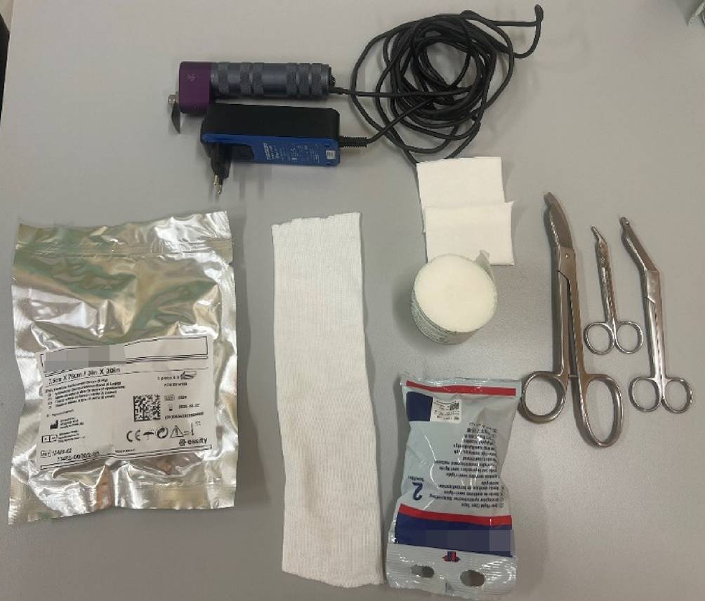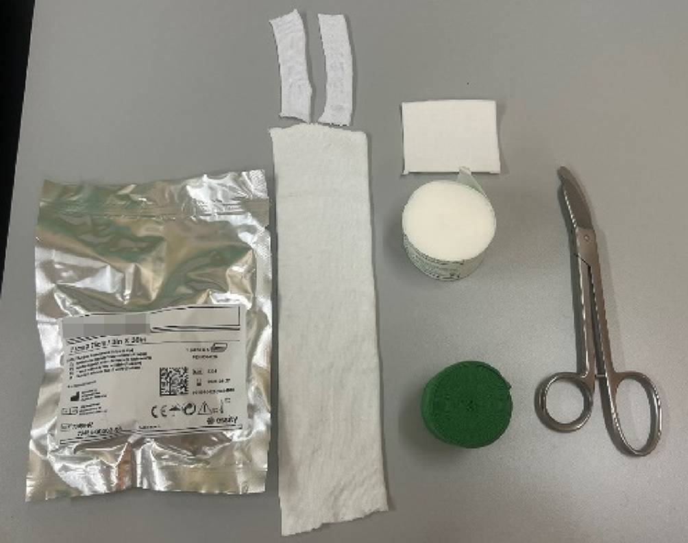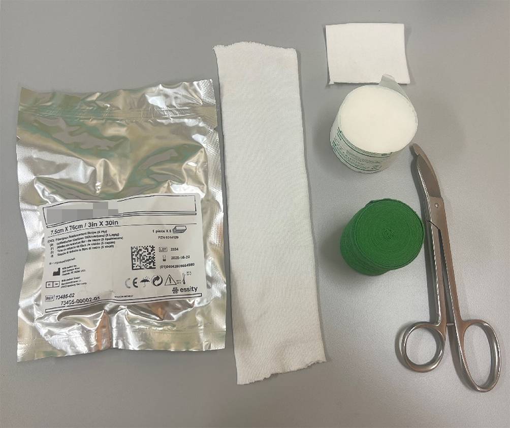Standardmaterial zum Gipsen. Hardcast-Longuetten in verschiedenen Größen, Softcast-Bandagen in verschiedenen Breiten. Polstermaterial, Stockinette in verschiedenen Größen. Gipsspreizer, Gipsscheren in verschiedenen Größen, oszillierende Säge