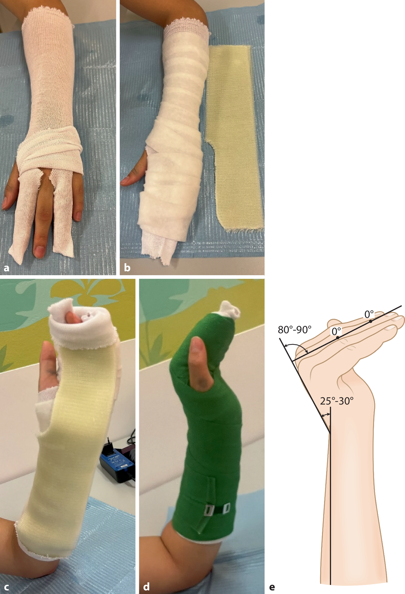 Vorbereiten der Hand durch Anlage des Polsterschlauches bis zur Ellbeuge. Um ein Schwitzen zwischen den Fingern zu vermeiden, empfehlen wir das (faltenfreie) Einlegen von Kompressen interdigital oder alternativ das Überziehen jedes zweiten Fingers mit einem kleinen Schlauchverband (a). Polstern der prominenten Knochenvorsprünge über Radius- und Ulnastyloid (s. auch Abb. 3a). Beachten sie auch die bereits vorbereitete Hardcast-Longuette. Für den Daumen wird die Schiene ausgeschnitten, um Druckstellen zu vermeiden (b). Die Longuette wird volar von 3 Fingerbreit distal der Ellbeuge nach proximal angelegt und gut anmodelliert (c). Zum Abschluss wird die Gipsschiene mit einer elastischen Binde fixiert (d). Die Hand wird in Intrinsic-Plus-Stellung zur Vermeidung von Kontrakturen: Handgelenk: 20–30° Dorsalextension, MCP 70–80° Flexion, PIP/DIP, gestreckt bis max. 10° Flexion (e)