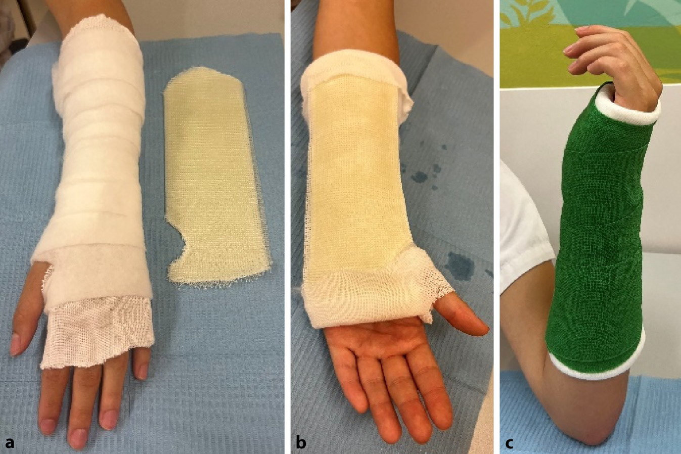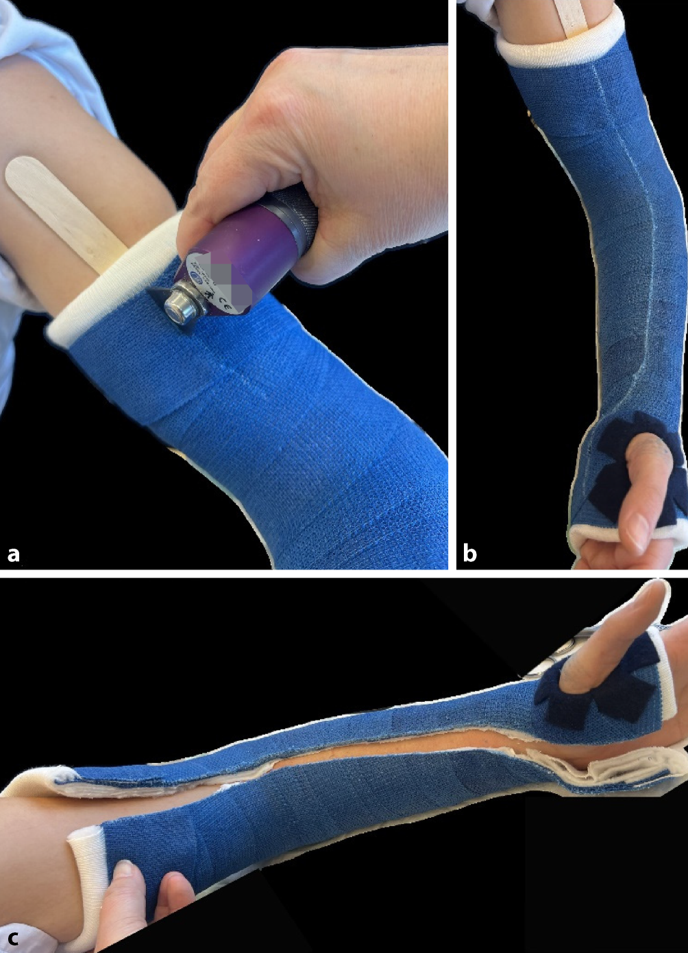 Wir empfehlen, vor der Verwendung den Kindern zu demonstrieren, dass die Gipssäge die Haut bei sachgerechtem Gebrauch nicht verletzen kann. Bei der Verwendung von Gipssägen entsteht Hitze. Daher sollte man beim Aufsägen des Gipses zwischendurch Pausen einlegen. Wenn man darauf achtet, den Gips im Bereich des Softcasts zu spalten, entsteht etwas weniger Hitze. Eine weitere Möglichkeit ist es, etwas unter die Säge zu legen, wir nutzen hierfür einen Holzspatel (a). Der Gips muss über die gesamte Länge aufgesägt werden (b). Bei instabilen oder reponierten Frakturen empfiehlt es sich, den Gips auf der der Dislokation abgewandten Seite zu spalten (z. B. palmare Spaltung bei initialer Dislokation des Vorderarms nach dorsal). Am Ende der Spaltung muss der Gips auf gesamter Länge geöffnet sein, und sämtliches Polstermaterial muss bis auf die letzte Faser aufgeschnitten sein (c). Zum Abschluss wird der Gips mit einer elastischen Binde wieder fixiert. Nach ca. 5 Tagen kann bei schmerzfreiem Patienten der Gipsschluss durch Umwickeln mit einer weiteren Binde Softcast erfolgen