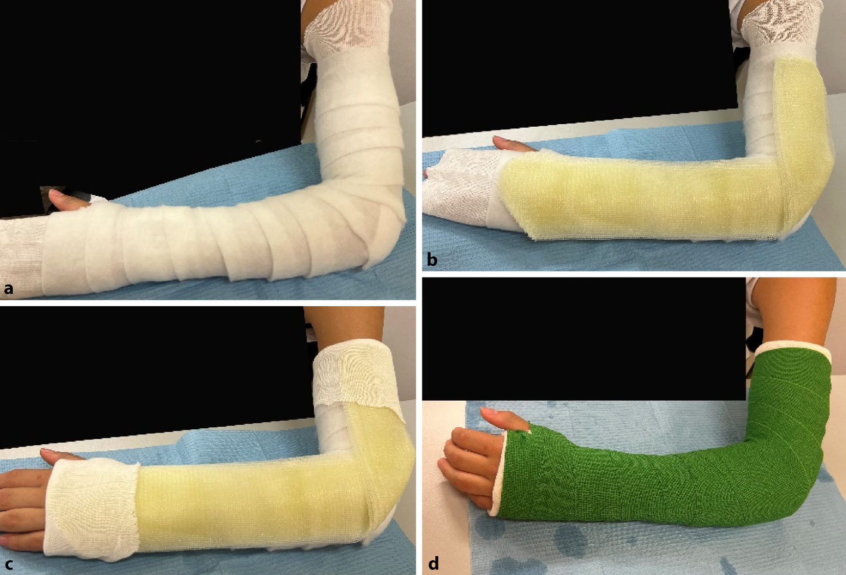 Verletzungen der oberen Extremitäten gehören zu den häufigen Verletzungen im Kindesalter. Auch heute noch ist, insbesondere in der Kindertraumatologie, die konservative Behandlung dieser Verletzungen für viele Frakturmuster der Goldstandard. Bei Kindern und Jugendlichen bestehen häufig stabile Verletzungen, welche je nach Lokalisation und Alter noch ein großes Korrekturpotenzial besitzen [1]. Die Technik des Gipsens ist keine neue Erfindung, wird jedoch oft nur wenig gelehrt. Daher möchten wir mit diesem Artikel die korrekte Technik der häufigsten Gipse der oberen Extremität nachvollziehbar darstellen.