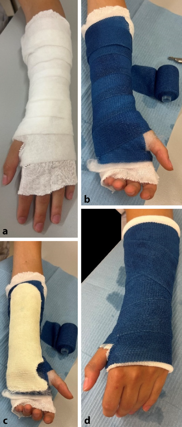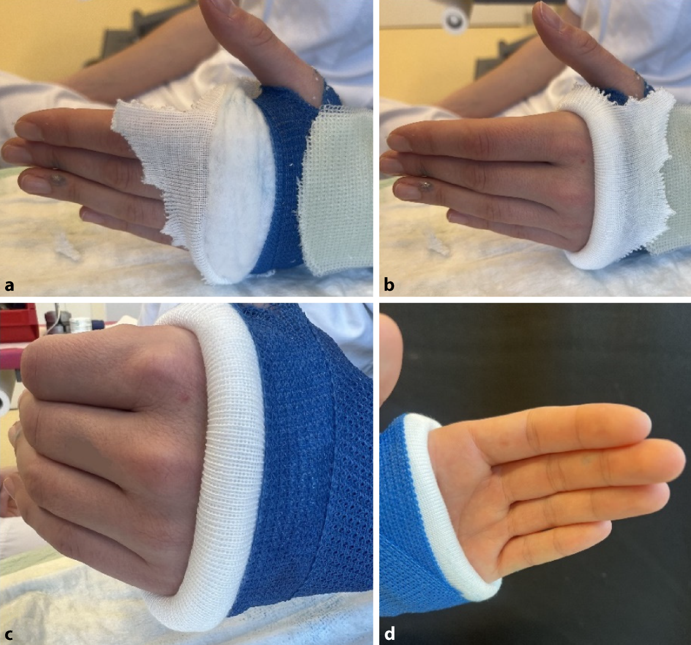 Ziel: Damit ein Gips auch langfristig bequem ist und es zu keinen Druckstellen kommt, sollten bei der Ausarbeitung ein paar Dinge beachtet werden. Um bei der Ausarbeitung einen weichen Rand zu erhalten, sollten der Strumpf und das Polster den eigentlichen Gips überragen (a). So kann nach Applikation der ersten Schicht Softcast sowie ggf. Anbringen der Verstärkung der Rand umgeschlagen werden, und es entsteht ein weicher Abschluss ohne die Gefahr von scharfen Kanten (b). Damit der Gips bequem ist und die Hand im Alltag brauchbar bleibt, sollte unbedingt darauf geachtet werden, dass die MCP-Gelenke frei bleiben (c). Im Bereich der Handfläche sollte der Gips daher maximal bis zur Hohlhandbeugefalte reichen (d)