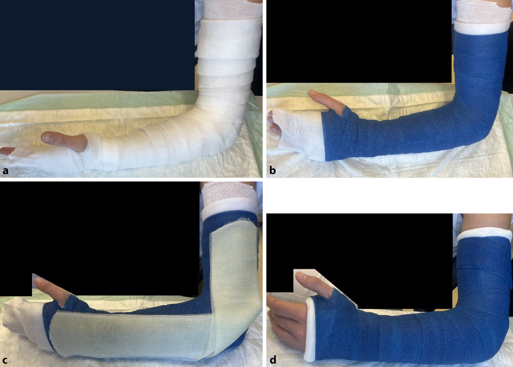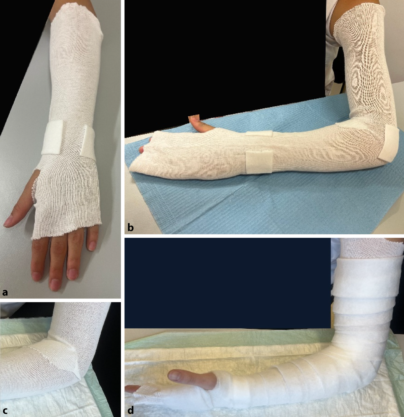 Anlegen des Polsterschlauches bis zur Schulter, Polstern mit Watte oder Klebefilz, v. a. im Bereich der prominenten Knochenvorsprünge an Ulna und Radiusstyloid, Epikondylen des Ellbogens (s. auch Abb. 3b). Polsterung mit Watte (a). Das Polstermaterial wird zuerst mit einer Schicht Softcast umwickelt (b). Hier sollte darauf geachtet werden, das Polstermaterial proximal und distal ca. 2 cm überstehen zu lassen, damit der Gips am Ende einen weichen Rand erhält. Proximal reicht der Gips bis 1 Handbreit distal der Axilla. Distal reicht der Gips bis in die distale Hohlhandbeugefalte, sodass die MCP frei beweglich bleiben (s. auch Abb. 4). Anlegen der Longuette L‑förmig an der Außenseite des Armes. Das Umklappen der Longuette zum L über dem Ellbogen erhöht die Stabilität (c). Der Polsterschlauch wird mit der überstehenden Watte umgeschlagen, es entsteht ein weicher Rand. Fixieren mit einer Softcast-Longuette. Handgelenkposition neutral. Ellbogen 90° gebeugt (d). Zum korrekten Anmodellieren des Gipses empfehlen wir des Weiteren bis zum Aushärten das Umwickeln mit einer nassen Mullbinde. So können die verschienen Schichten des Gipses sich gut miteinander verbinden und aushärten. Bei frischen Frakturen mit deutlichem Risiko der Schwellung Gipsspaltung unbedingt empfohlen. Bei der Spaltung des Gipses ist darauf zu achten, auch das Polstermaterial bis auf die letzte Faser zu spalten (s. Abb. 9) Selbstverständlich muss bei diesem Gips noch die Ausarbeitung des Daumens erfolgen (s. Abb. 5)