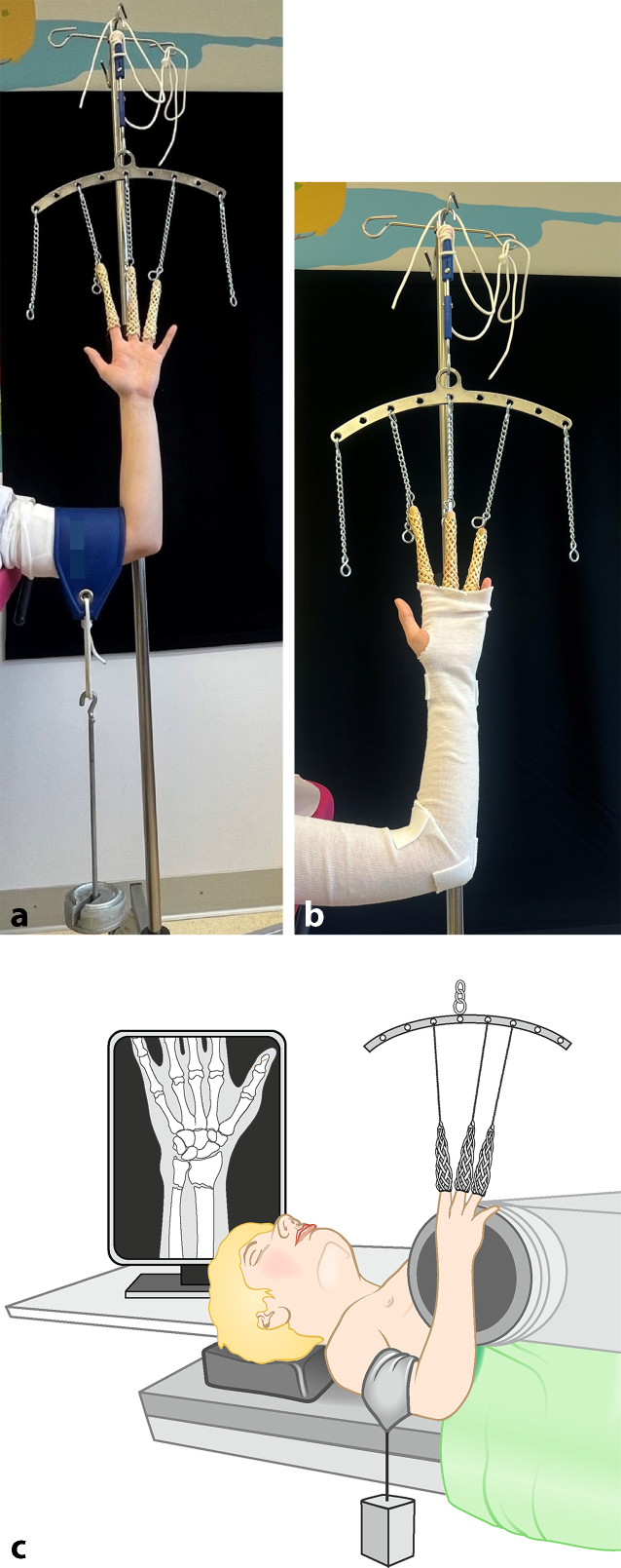Gebrauch der Fingerextensionshülsen/Fingerstraps. Diese Installation bietet einem mehrere Vorteile. Zum einen kann der Arm durch Verwendung von Fingerstraps an mindestens 3 Fingern stabil ausgehangen werden. Der Stumpf ist vor dem Aufhängen anzulegen. Der Arm sollte so platziert werden, dass er von allen Seiten gut zugänglich und die optimale Gipsposition eingestellt ist. Der Gips kann so perfekt anmodelliert werden. Auch leicht abgekippte und beginnend instabile Frakturen können durch Applikation eines Gewichtes (je nach Größe des Kindes 1–3 kg, schrittweise steigern) in Achse gehalten oder reponiert werden (a). Weitere Vorteile sind, dass durch das Aushängen (auch ohne Gewicht) eine Assistenzperson zum Gipsen eingespart werden kann (b) und allein durch das Aushängen eine gewisse Analgesie erreicht wird, welche das Gipsen für die Patienten angenehmer macht. Diese Technik kann sowohl für Oberarmgipse als auch für Vorderarmgipse genutzt werden. Zusätzlich bietet sich die Möglichkeit der Installation eines C‑Arms zur Repositionskontrolle (c)