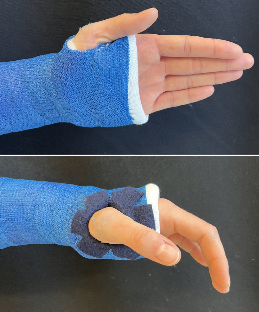 Bei der Ausarbeitung ist besonders der Daumen zu beachten. Das Daumengrundgelenk sollte frei sein (Abb. 5 oben). Die Ränder des ausgeschnittenen Daumens sind z. B. mit Klebefilz gut zu polstern (Abb. 5 unten), da durch das Ausschneiden scharfe Ränder entstehen können