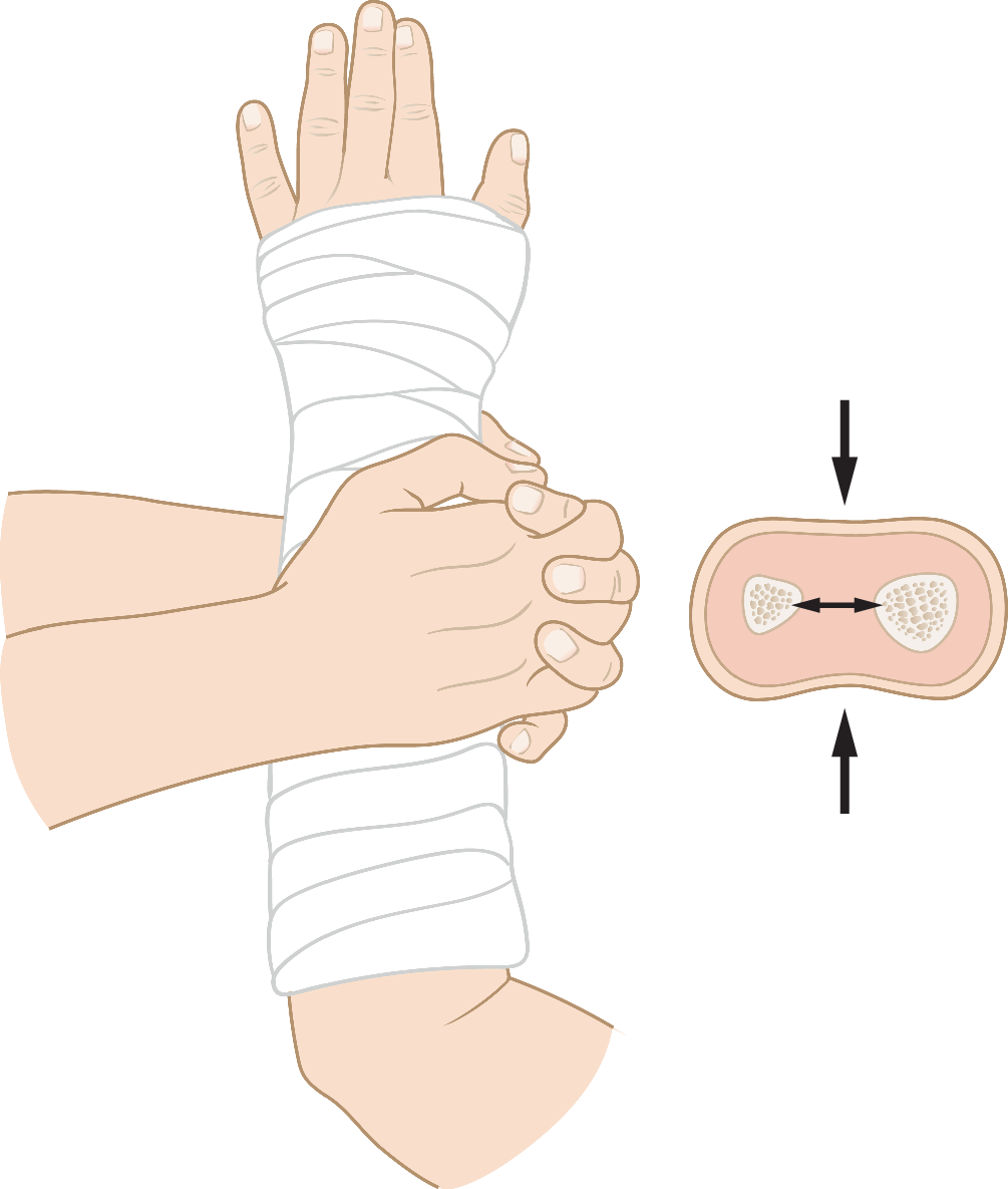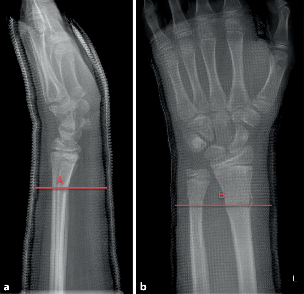 Durch Anmodellieren des Gipses mit flacher Hand wird der Gips in eine ovaläre Form gebracht. Hierdurch kommt es zum Aufspannen der Membrana interossea und somit zur zusätzlichen Stabilisierung der Fraktur. Es wird ein optimaler Cast-Index (s. Abb. 6a, b) erreicht. Des Weiteren liegt der Gips so dem Arm eng an und kann die Fraktur besser abstützen