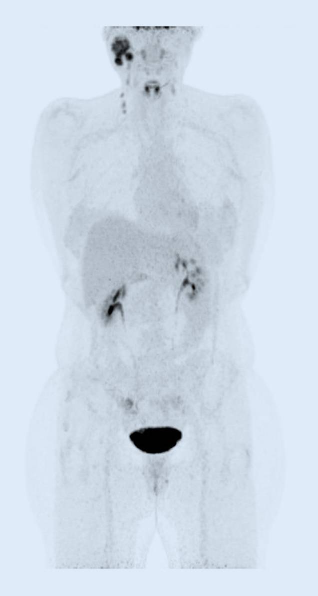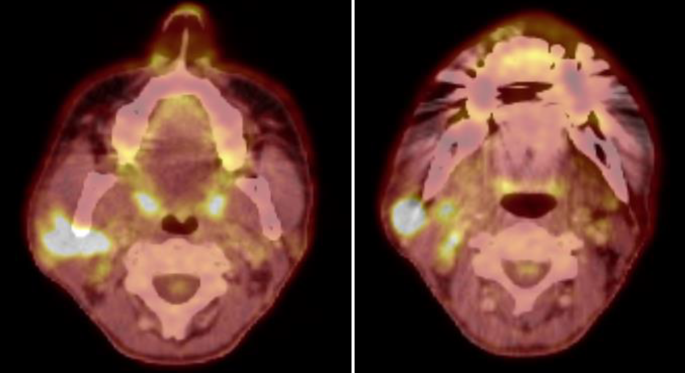 18-Fluordesoxyglucose-Positronenemissionstomographie-Fusions-Computertomographie (18-FDG-PET-Fusions-CT) und Ganzkörper-18-FDG-PET vom Juni 2023 zeigen den Primärtumor und die Hals-Lymphknotenmetastasen, jedoch keine Fernmetastasierung (Abb. 1 und 2).