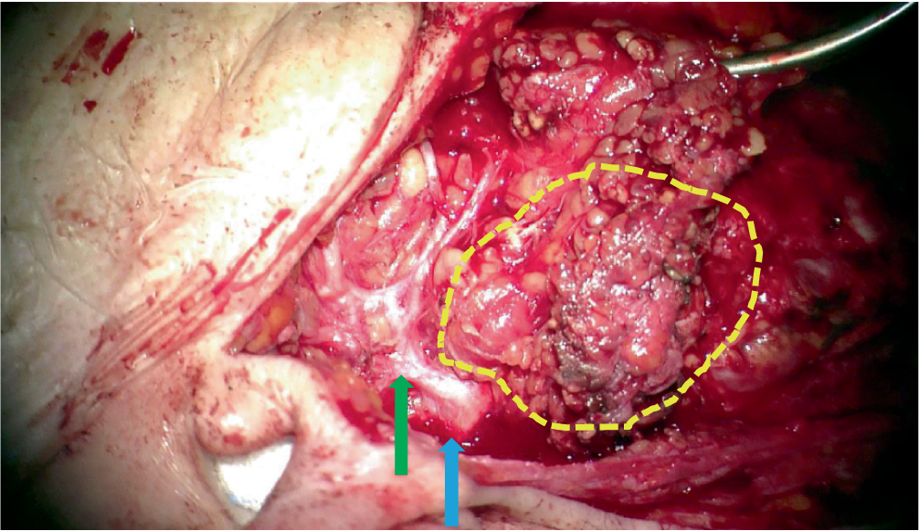 Intraparotideal gelegener Tumor: gelb umrandet: palpabler, teilweise sichtbarer Tumor; grüner Pfeil: frontofazialer Hauptast N. facialis; blauer Pfeil: Fazialisstamm