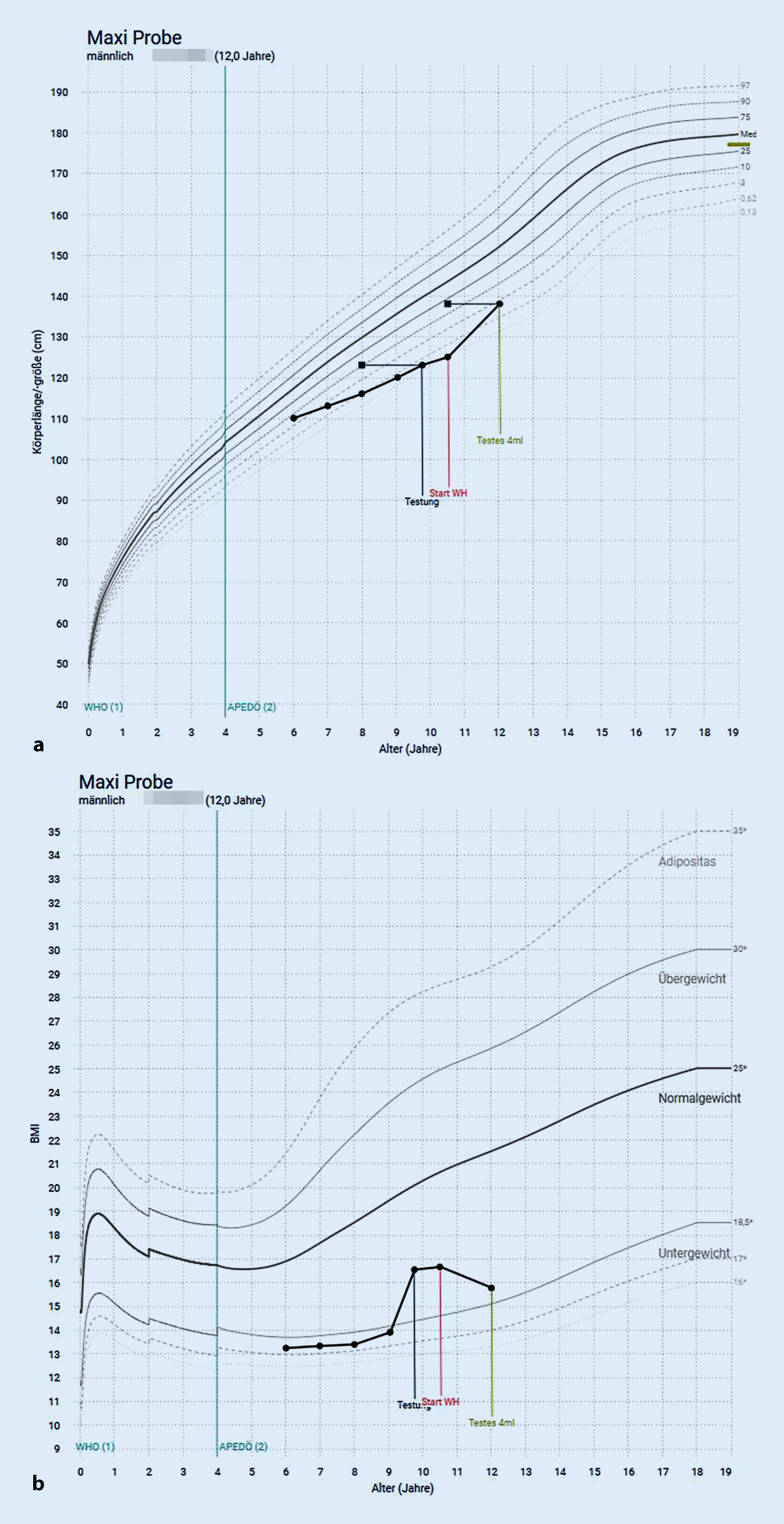 Grafische Darstellung von Messwerten am Beispiel: a der Körpergröße, b des BMI: Im Alter 0–4 Jahre werden die WHO-Standards verwendet [1], danach die neuen österreichischen Referenzen (auf der Originalkurve [2] im Beitrag [6]). a Die Referenzen werden als Perzentilen dargestellt, neben der 3.–97. Perzentile findet sich für niedrige Werte auch die 0,62 und 0,12 Perzentile, die die für Abklärungen relevanten (−2,5 und −3,0) repräsentieren (siehe Text „Darstellung der Daten“ zur Erklärung). Pfeile markieren klinisch relevante Zeitpunkt (an diesem Beispiel Testung, WH-Start: Therapiebeginn, Testes 4 ml: Pubertätsbeginn). Die Datengrundlage stammt aus der Messdatentabelle (Abb. 2); dicke schwarze Linie markiert das Knochenalter und ist durch horizontalen Strich mit dem korrespondieren chronologischen Alter verbunden. ZL familiäre Ziellänge („target height“). b Die Darstellung des BMI wird als Rohwert (aktuelle Berechnung anhand Körpergewicht und Körpergröße) eingetragen (y-Achse). Die Interpretation von aktuellem Ernährungszustand und Verlauf erfolgt durch die Zuordnung zu den Bereichen Normalgewicht–Untergewicht–Übergewicht–Adipositas im Hintergrund (siehe Beschriftungen rechts). Der Vergleich zwischen BMI (Rohwert) und dem Equi-BMI ist in Abb. 2 möglich (siehe dort)