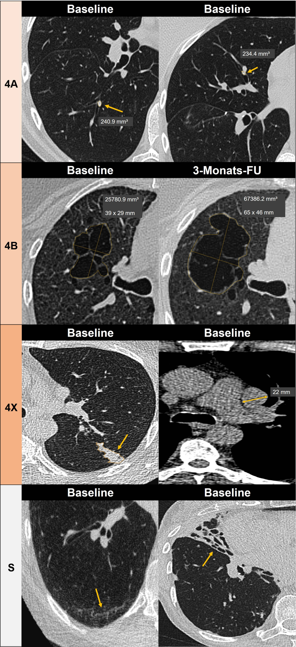 Beispiele für Lungenläsionen unter Anwendung von Lung-CAD-Software mit Klassifikation gemäß Lung-RADS: 4A Solide endobronchiale Rundherde segmental im rechten Unterlappen (links) und Mittellappen (rechts) in der Baseline-LDCT, histologisch: typisches Karzinoid. 4B Multilokuläre Zyste mit deutlicher Größenzunahme und vermehrter Septierung in der 3‑Monats-Follow-up-LDCT, histologisch: adenoid-zystisches Lungenkarzinom. 4X Segmentale Obstruktion eines linken Oberlappenbronchus mit ipsilateraler mediastinaler Lymphadenopathie, histologisch: kleinzellig neuroendokrines Karzinom, Stadium T2aN2M0. ModifierS (Klinisch relevante Befunde ohne Hinweis auf Lungenkrebs). Links Interstitielle Lungenanomalien (ILA), Rechts Bronchiektasen