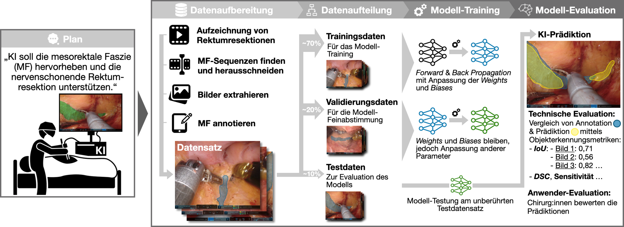 Übersicht über die Entwicklung einer KI-Anwendung am Beispiel der Erkennung der mesorektalen Faszie bei minimal-invasiven Rektumresektionen. IoU Intersection-over-Union, DSC Dice Similarity Coefficient