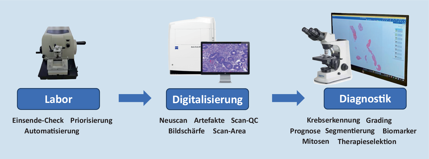 Pathologie-KI (künstliche Intelligenz) verbindet Pathologie mit Informatik, für erweiterte Automatisierung im Labor, verbesserte Digitalisierung, unterstützte Befundung, systematische Qualitätssicherung und neue, virtuelle Biomarker.