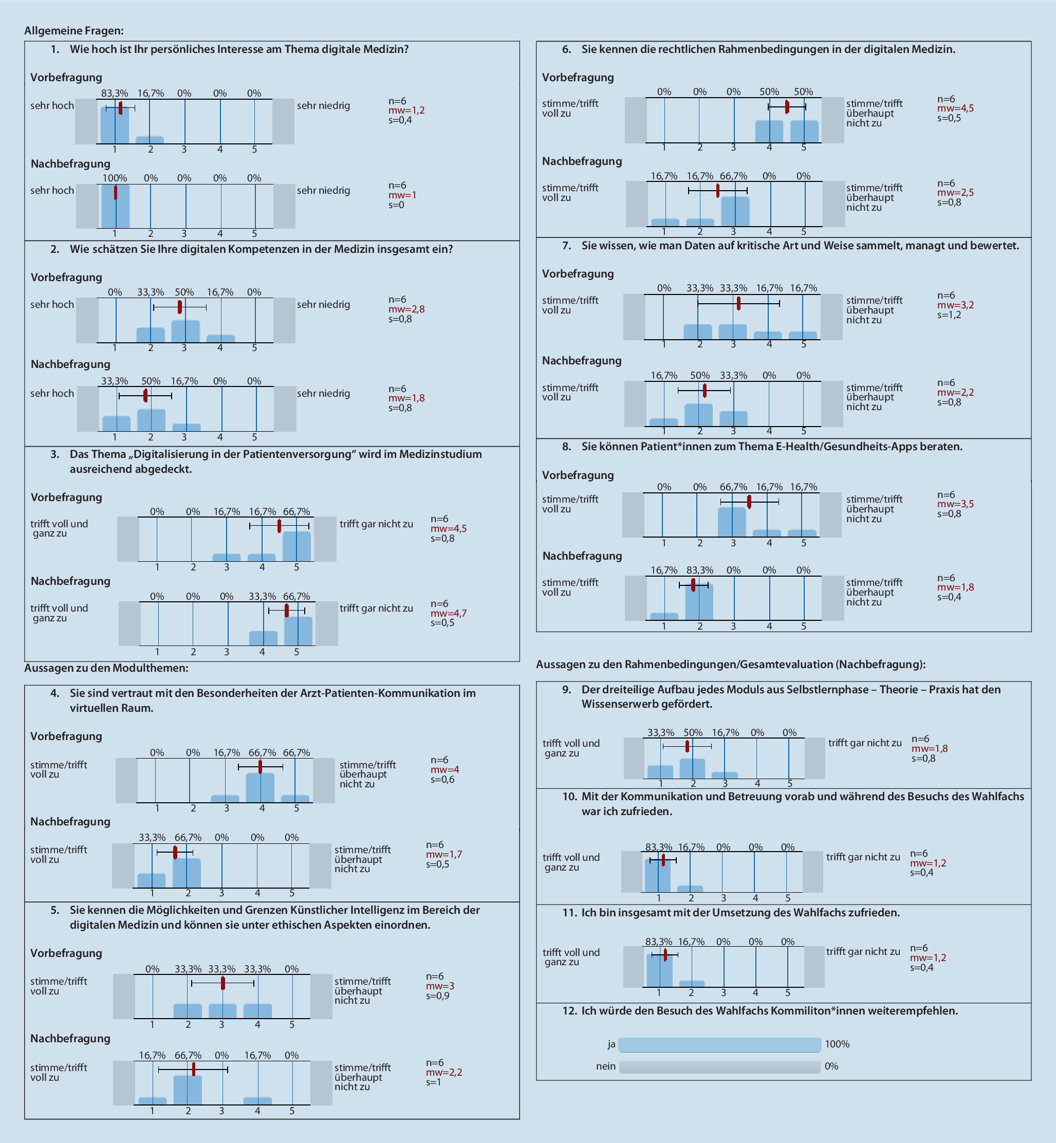 Im Sommersemester 2022 nahmen 6 Studierende am Wahlfach Digitale Kompetenzen in der Medizin teil. In Abb. 1 sind Ergebnisse der Befragungen dargestellt, aufgrund der niedrigen Stichprobengröße ausschließlich im deskriptiven Format.
