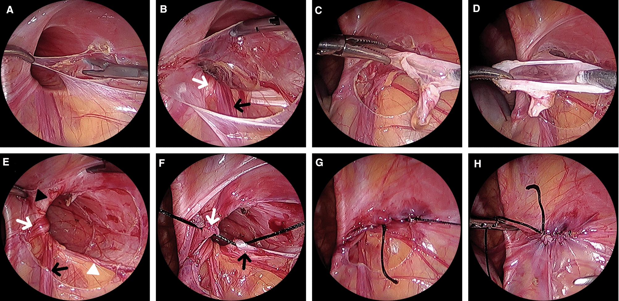 IPTR procedure. A The hernial sac was incised at the lateral side of the internal inguinal ring. B The vas deferens (white arrow) and spermatic cord (black arrow) were separated from the hernial sac. C The entire hernial sac was transected. D The hernial sac was completely removed. E Internal inguinal ring: the iliopubic tract (white arrowhead) and the medial muscular arch of the transversalis abdominis (black arrowhead). Preservation of the vas deferens (white arrow) and spermatic cord (black arrow). F First stitch of iliopubic tract repair. Iliopubic tract (black arrow) and medial muscular arch of the transversalis fascia suture (white arrow). G Completion of IPTR. H Complete peritoneal repair. IPTR iliopubic tract repair