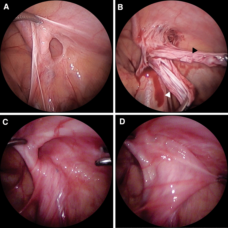 Specific appearance of recurrent PIH. A Recurrent PIH. B Two hernial sacs were observed due to formation of another peritoneal hernial sac (black arrowhead) in addition to the hernial sac (white arrowhead) that was not removed during the first operation. C The internal ring was widened. D When the hernial sac was pulled into the abdominal cavity, no loosened hernial sac was observed. PIH pediatric inguinal hernia