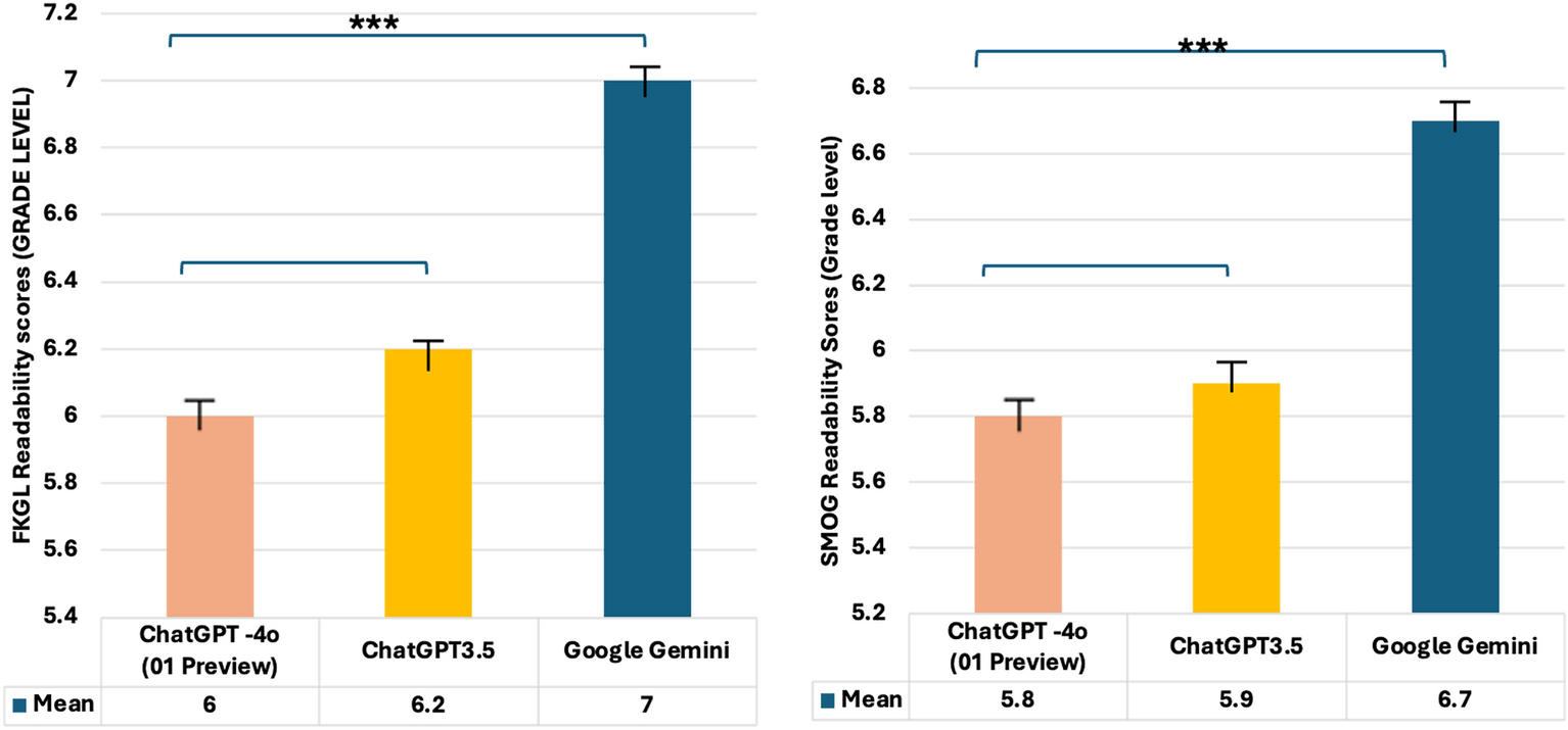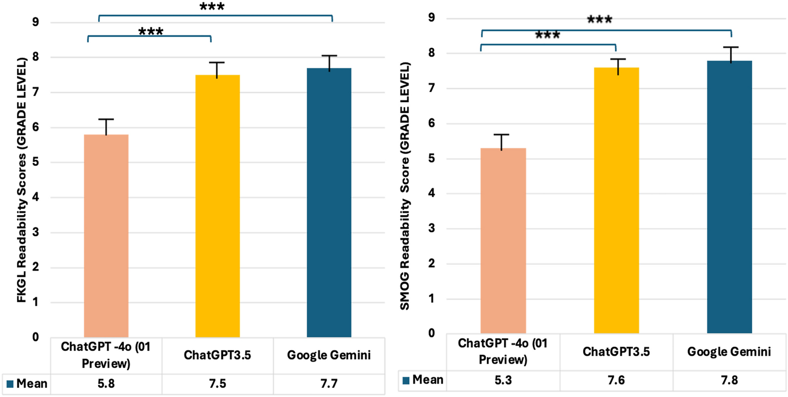 After applying the LLMs, significant improvements were observed (p < 0.001). ChatGPT-3.5 reduced the readability scores to a SMOG of 7.6 ± 1.2 and an FKGL of 7.7 ± 1.4. Google Gemini also contributed to improved readability, with a SMOG of 7.8 ± 1.3 and an FKGL of 7.5 ± 1.1, while ChatGPT-4o (o1 Preview) demonstrated the most significant enhancement, achieving or staying below the specified sixth-grade reading level (SMOG 5.3 ± 1.6, FKGL 5.8 ± 1.5). Additionally, in a head-to-head analysis of readability improvements made by the LLMs, ChatGPT-4o (o1 Preview) consistently outperformed both ChatGPT-3.5 and Google Gemini by a significant margin (p < 0.001 for both comparisons) (Fig. 3). These results highlight the transformative potential of LLMs, especifically ChatGPT-4o (o1 Preview), in simplifying complex medical materials, making them more accessible and user-friendly for patients.