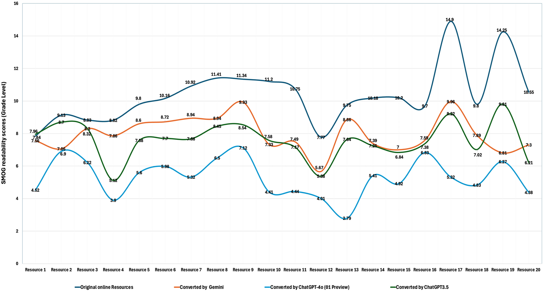 After evaluations of the top 20 search results, as they account for more than 95% of total web traffic among users of online web search engines [20], all results exceed the sixth-grade reading level recommended by the NIH and the AMA, which is suggested for ensuring the average American can understand health information [6, 8, 44]. All the evaluated LLMs demonstrated the ability to rewrite or improve the readability of online educational resources. However, ChatGPT-4o (o1 Preview) outperformed other models, including ChatGPT-3.5 and Google Gemini, by significantly enhancing readability and consistently meeting or staying below the grade level recommended by organizations like the NIH and AMA for the average American to understand health information [16, 44]. ChatGPT-4o (o1 Preview) adapted the content to a reading level at or below the average person’s proficiency, making the information more accessible and easier to understand for a broader audience. While ChatGPT-3.5 and Google Gemini improved the readability of online PEMs, they did not consistently meet the recommended standards set by the NIH and AMA for understanding health information. This underscores ChatGPT-4o (o1 Preview)’s superior ability to simplify complex medical language into more digestible formats for users.