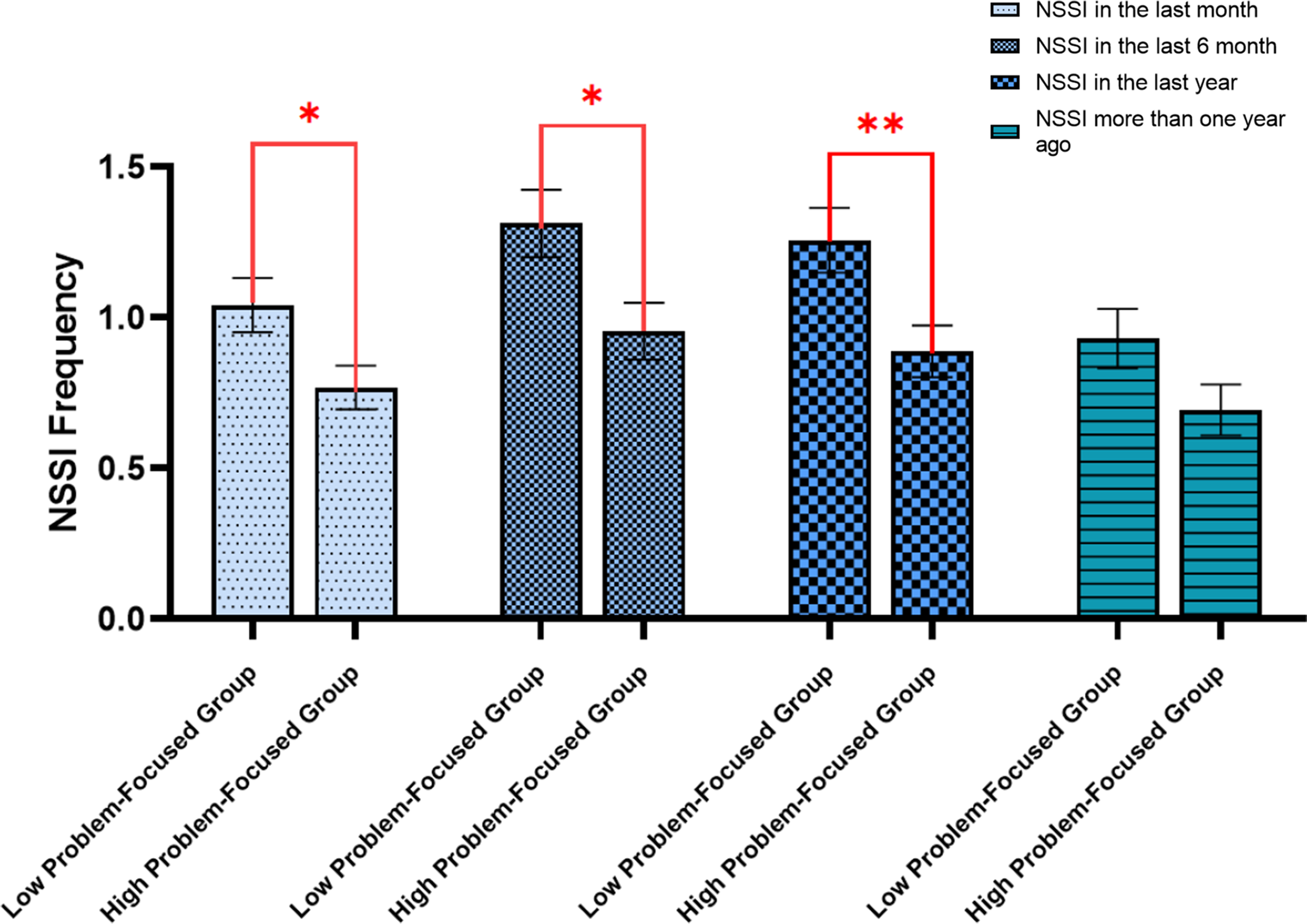 61]. Therefore, a possible explanation of our findings is that adolescents with SAD in the low problem-focused group may turn to NSSI as a way to alleviate intense emotional pain, because their coping strategies do not effectively manage stressful circumstances [