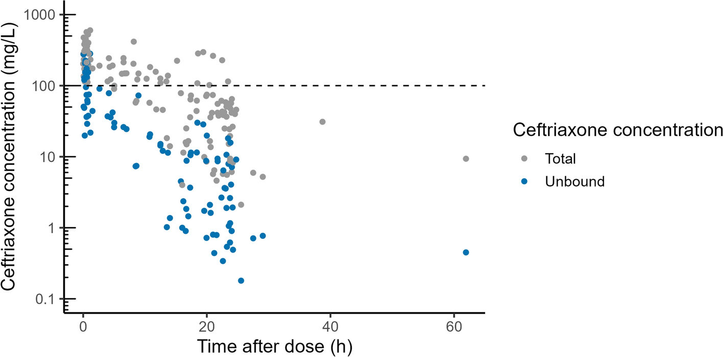 Total and unbound ceftriaxone concentrations versus time after dose administration. Ceftriaxone concentrations displayed on a log-scale; the dashed line depicts the ceftriaxone concentration of 100 mg/L to illustrate the trough concentration threshold for toxicity